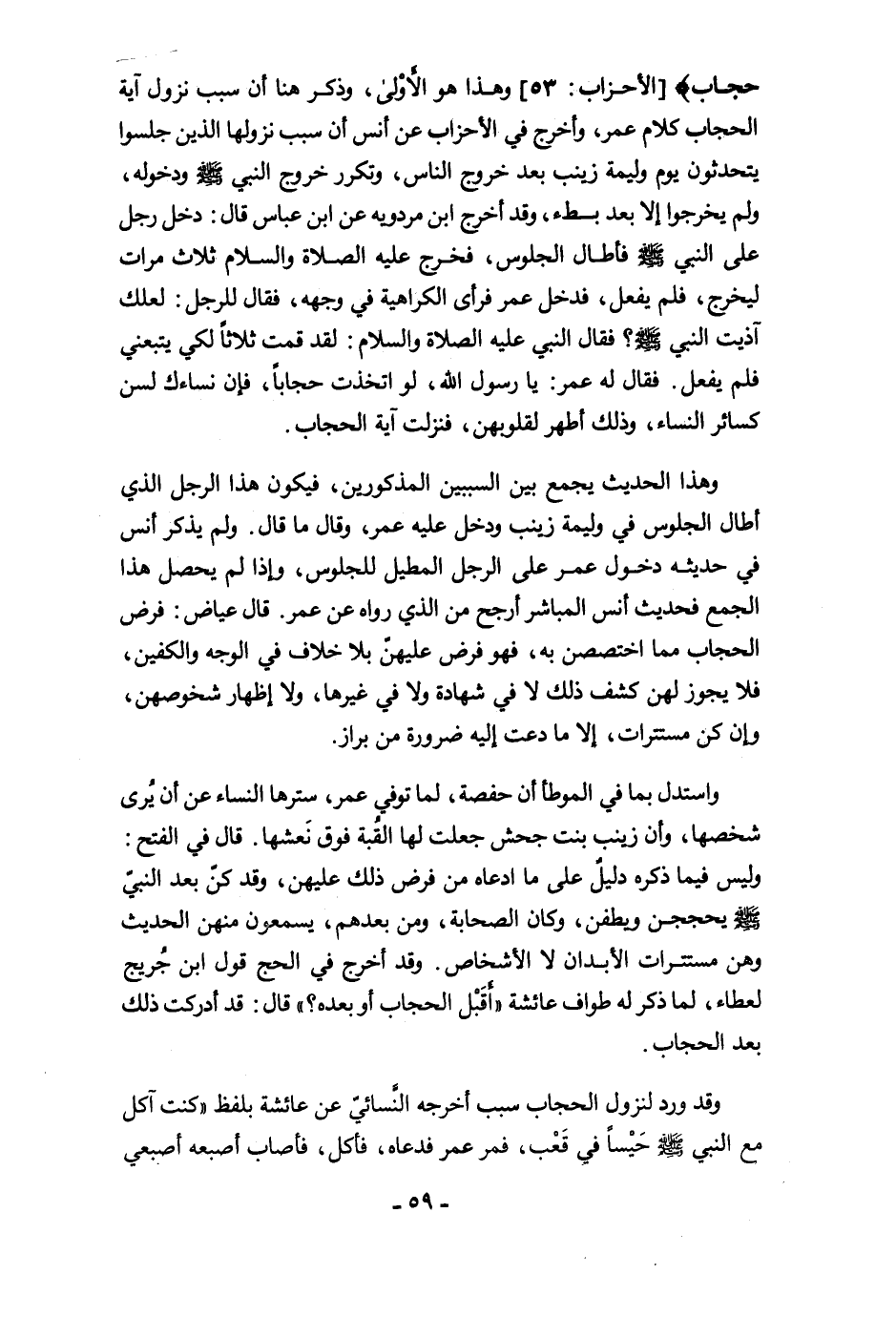 وهذا الحديث يجمع بين السببين المذكورين، فيكون هذا الرجل الذي أطال الجلوس في وليمة زينب ودخل عليه عمر، وقال ما قال. ولم يذكر أنس في حديثه دخول عمر على الرجل المطيل للجلوس، وإذا لم يحصل هذا الجمع فحديث أنس المباشر أرجح من الذي رواه عن عمر. قال عياض: فرض الحجاب مما اختصصن به، فهو فرض عليهنّ بلا خلاف في الوجه والكفين، فلا يجوز لهن كشف ذلك لا في شهادة ولا في غيرها, ولا إظهار شخوصهن، وإن كن مستترات، إلا ما دعت إليه ضرورة من براز.