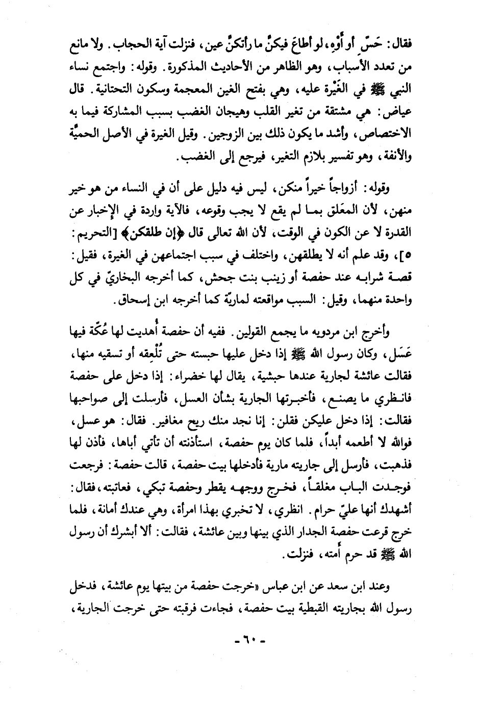 وقوله: أزواجًا خيرًا منكن، ليس فيه دليل على أن في النساء من هو خير منهن؛ لأن المعَلق بما لم يقع لا يجب وقوعه، فالآية واردة في الإخبار عن القدرة لا عن الكون في الوقت, لأن الله تعالى قال {إِنْ طَلَّقَكُنَّ} [التحريم: 5]، وقد علم أنه لا يطلقهن، واختلف في سبب اجتماعهن في المغيرة، فقيل: قصة شرابه عند حفصة أو زينب بنت جحش، كما أخرجه البخاريّ في كل واحدة منهما، وقيل: السبب مواقعته لماريّة كما أخرجه ابن إسحاق.