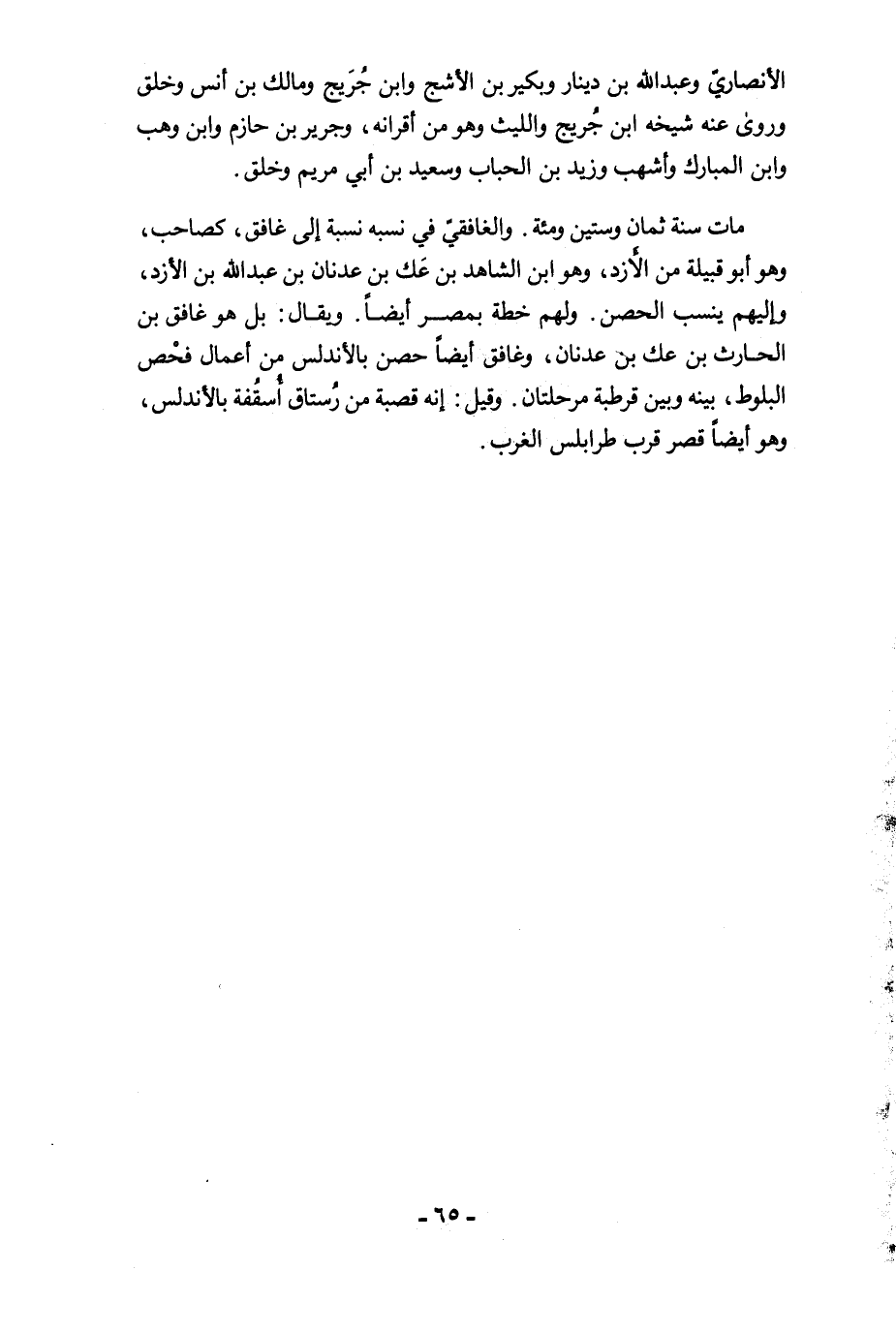 مات سنة ثمان وستين ومئة. والغافقيّ في نسبه نسبة إلى غافق، كصاحب، وهو أبو قبيلة من الأَزد، وهو ابن الشاهد بن عَك بن عدنان بن عبد الله بن الأزد، وإليهم ينسب الحصين. ولهم خطة بمصر أيضًا. ويقال: بل هو غافق بن الحارث بن عك بن عدنان، وغافق أيضًا حصن بالأندلس من أعمال فحْص البلوط، بينه وبين قرطبة مرحلتان. وقيل: إنه قصبة من رُستاق أُسقُفة بالأندلس، وهو أيضًا قصر قرب طرابلس الغرب.