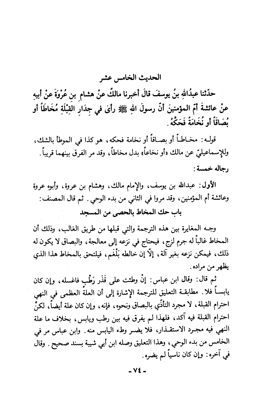 حَدَّثَنَا عَبْدُ اللَّهِ بْنُ يُوسُفَ قَالَ أَخْبَرَنَا مَالِكٌ عَنْ هِشَامِ بْنِ عُرْوَةَ عَنْ أَبِيهِ عَنْ عَائِشَةَ أُمِّ الْمُؤْمِنِينَ أَنَّ رَسُولَ اللَّهِ -صلى الله عليه وسلم- رَأَى فِي جِدَارِ الْقِبْلَةِ مُخَاطًا أَوْ بُصَاقًا أَوْ نُخَامَةً فَحَكَّهُ.