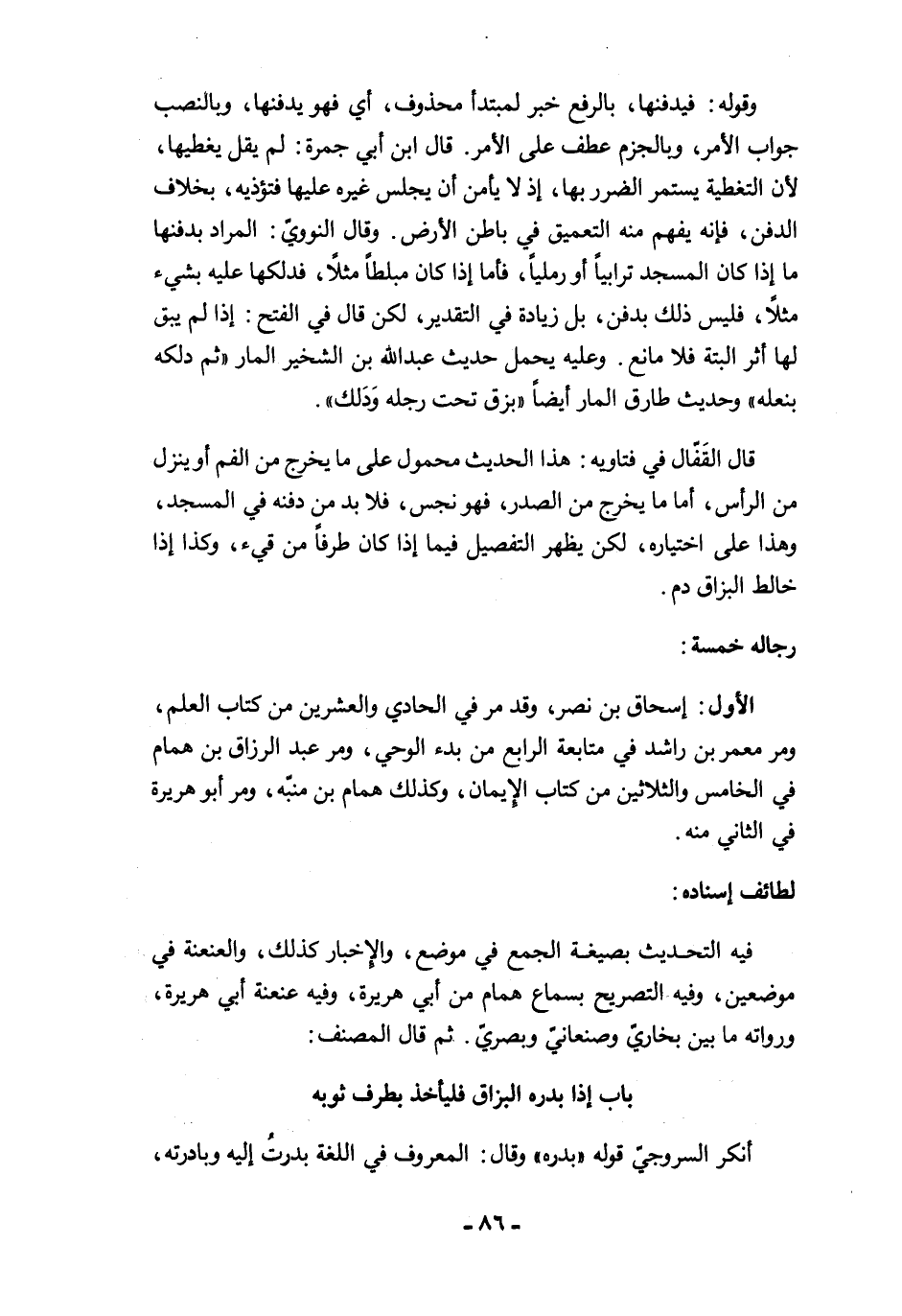 قال القَفّال في فتاويه: هذا الحديث محمول على ما يخرج من الفم أو ينزل من الرأس، أما ما يخرج من الصدر، فهو نجس, فلابد من دفنه في المسجد، وهذا على اختياره، لكن يظهر التفصيل فيما إذا كان طرفًا من قيء، وكذا إذا خالط البزاق دم.