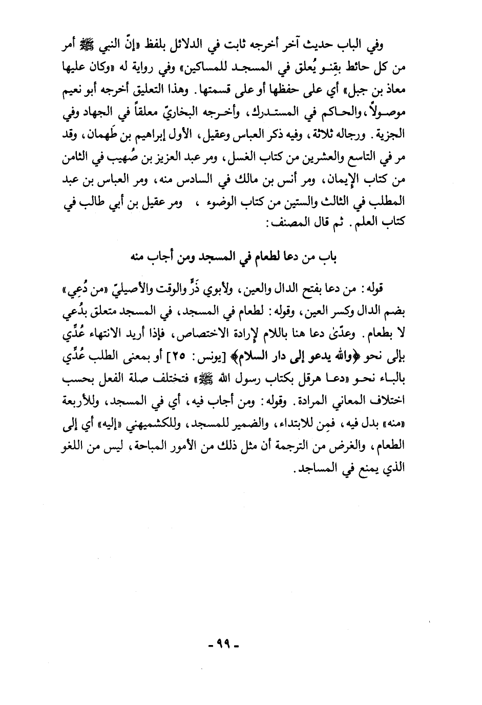قوله: من دعا بفتح الدال والعين، ولأبوي ذَرٍّ والوقت والأصيليّ "من دُعِي" بضم الدال وكسر العين، وقوله: لطعام في المسجد، في المسجد متعلق بدُعي لا بطعام. وعدّى دعا هنا باللام لإرادة الاختصاص، فإذا أريد الانتهاء عُدِّي بإلى نحو {وَاللَّهُ يَدْعُو إِلَى دَارِ السَّلَامِ} [يونس: 25] أو بمعنى الطلب عُدِّي بالباء نحو "دعا هرقل بكتاب رسول الله -صلى الله عليه وسلم-" فتختلف صلة الفعل بحسب اختلاف المعاني المرادة. وقوله: ومن أجاب فيه، أي في المسجد، وللأربعة "منه" بدل فيه، فمِن للابتداء، والضمير للمسجد، وللكشميهني "إليه" أي إلى الطعام، والغرض من الترجمة أن مثل ذلك من الأمور المباحة، ليس من اللغو الذي يمنع في المساجد.