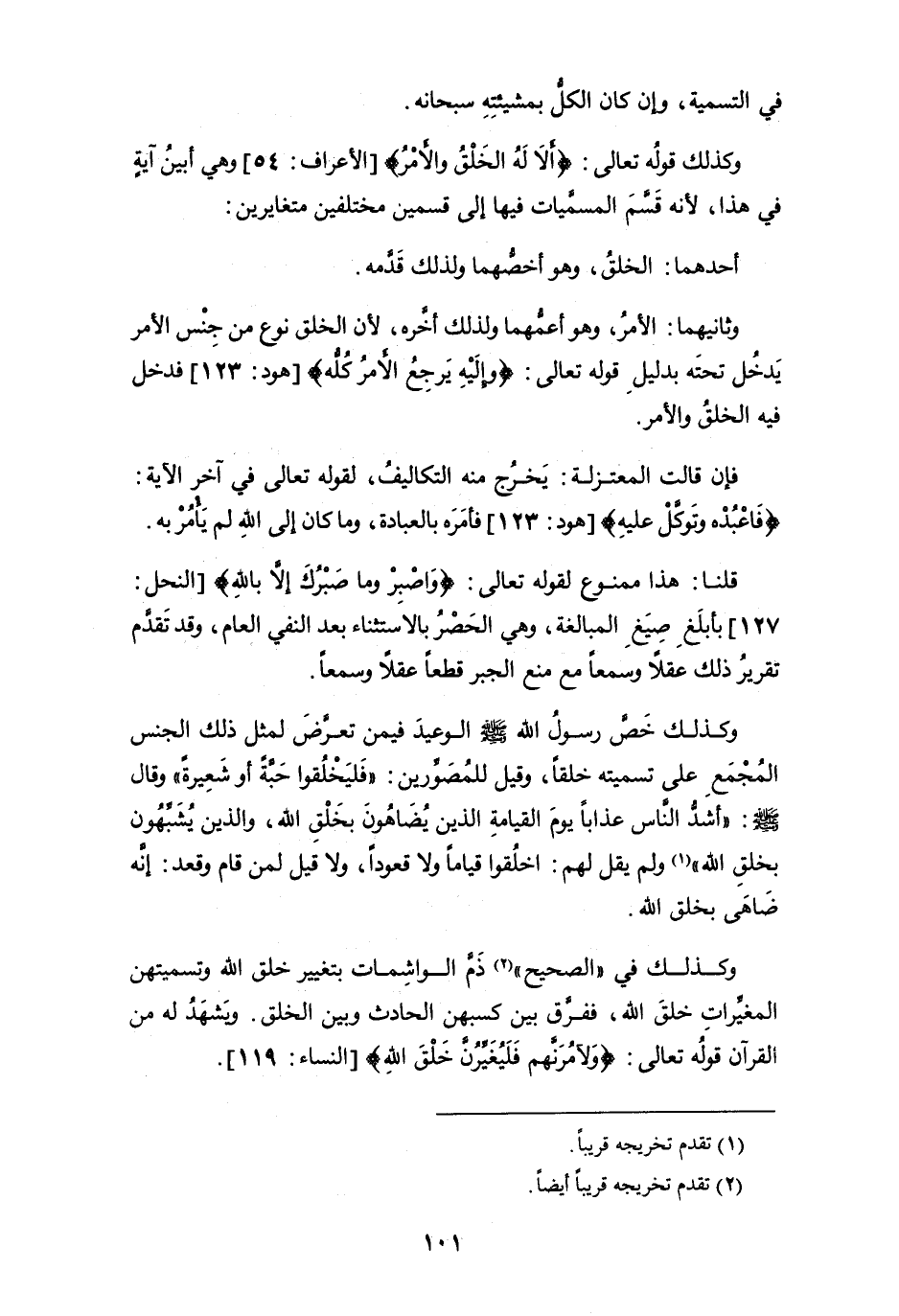 وكذلك في " الصحيح " (¬2) ذم الواشمات بتغيير خلق الله وتسميتهن المغيرات خلق الله، ففرَّق بين كسبهن الحادث وبين الخلق. ويشهد له من القرآن قوله تعالى: {ولآمُرَنَّهم فَلَيُغَيِّرُنَّ خَلْقَ الله} [النساء: 119].