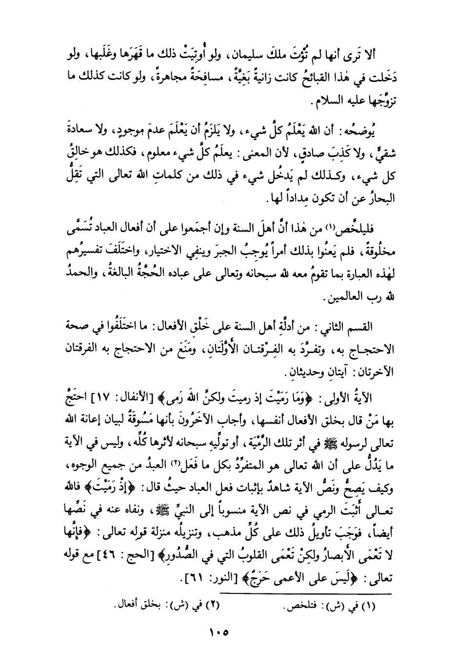 فليلخص (¬1) من هذا أن أهل السنة وإن أجمعوا على أن أفعال العباد تُسَمَّى مخلوقةً، فلم يعنوا بذلك أمراً يُوجِبُ الجبر وينفي الاختيار، واختلف تفسيرهم لهذه العبارة بما تقوم معه لله سبحانه وتعالى على عباده الحجة البالغة، والحمد لله رب العالمين.