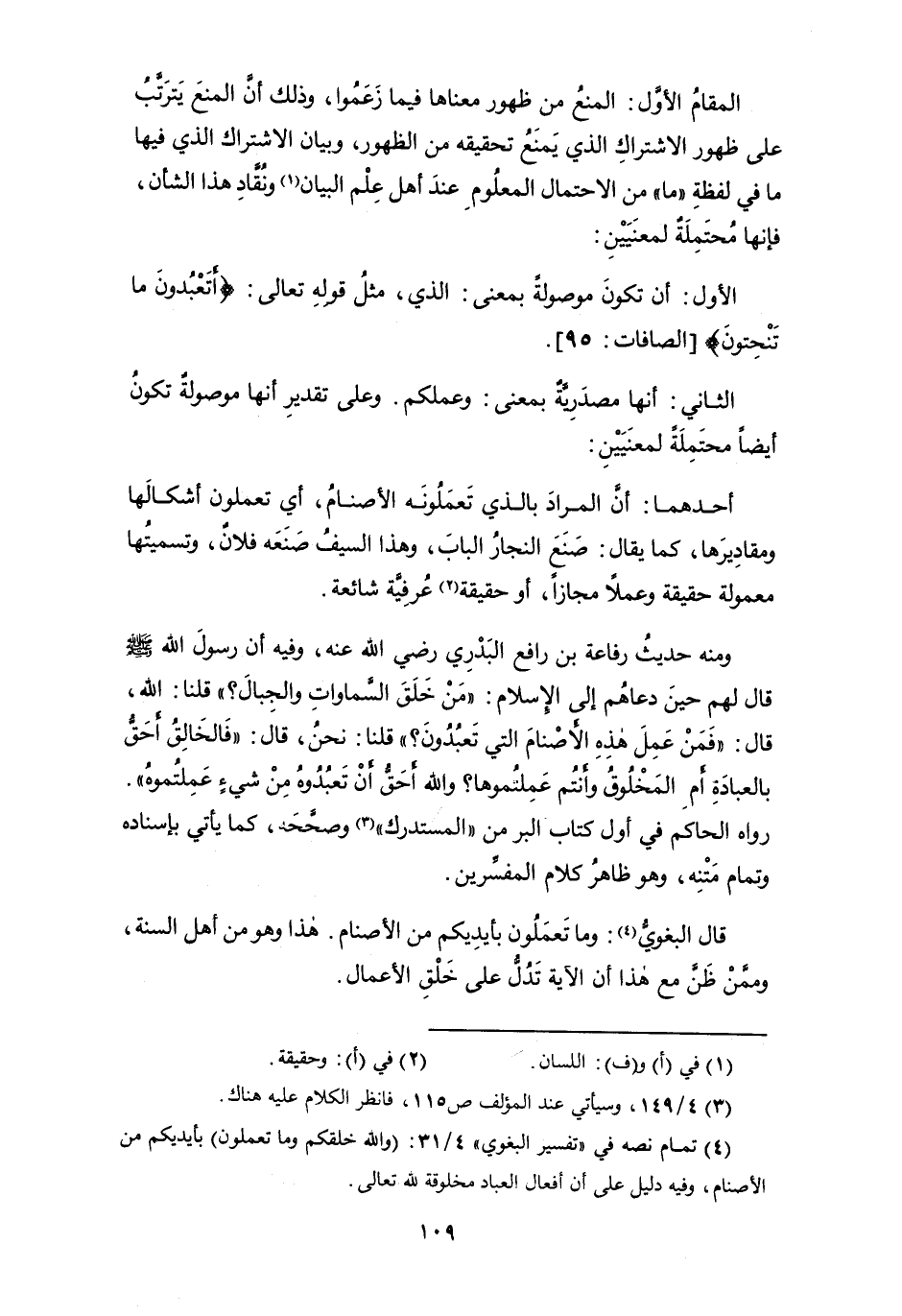 (¬4) تمام نصه في " تفسير البغوي " 4/ 31: {وَاللَّهُ خَلَقَكُمْ وَمَا تَعْمَلُونَ} بأيديكم من الأصنام، وفيه دليل على أن أفعال العباد مخلوقة لله تعالى.