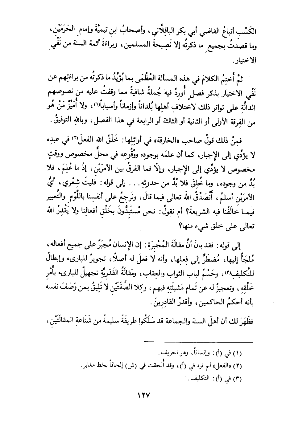 الكسب أتباع القاضي أبي بكر الباقلاني، وأصحاب ابن تيمية وإمام الحرمين، وما قصدتُ بجميع ما ذكرته إلاَّ نصيحة المسلمين، وبراءة أئمة السنة من نفي الاختيار.