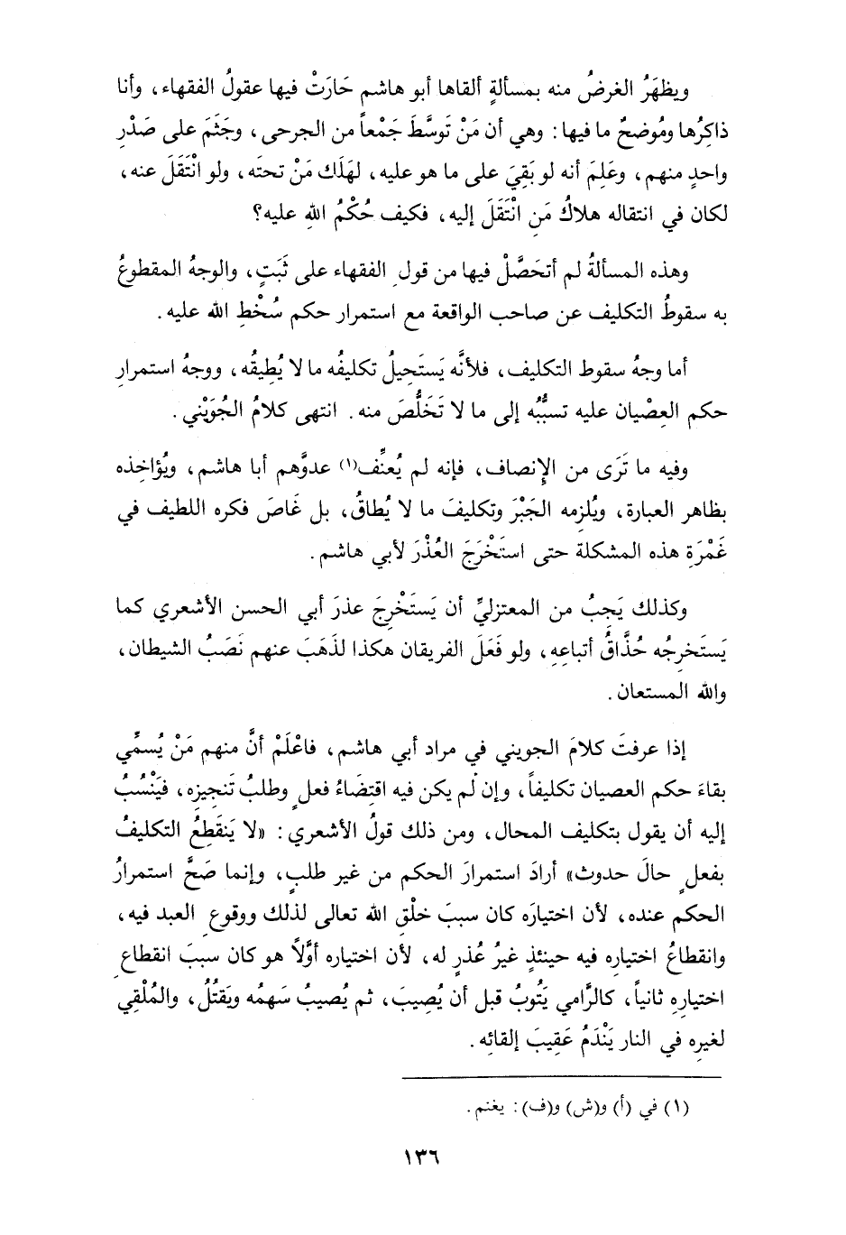 إذا عرفت كلام الجويني في مراد أبي هاشم، فاعلم أن منهم من يُسمِّي بقاء حكم العصيان تكليفاً، وإن لم يكن فيه اقتضاء فعلٍ وطلب تنجيزه، فيَنْسُبُ إليه أن يقول بتكليف المحال، ومن ذلك قول الأشعري: " لا ينقطع التكليف بفعلٍ حال حدوث " أراد استمرار الحكم من غير طلبٍ، وإنما صح استمرار الحكم عنده، لأن اختياره كان سبب خلق الله تعالى لذلك ووقوع العبد فيه، وانقطاع اختياره فيه حينئذٍ غير عُذرٍ له، لأن اختياره أوَّلاً هو كان سبب انقطاع اختياره ثانياً، كالرامي يتُوبُ قبل أن يُصيب، ثم يصيب سهمه ويقتل، والمُلْقِي لغيره في النار يندَمُ عقيب إلقائه.