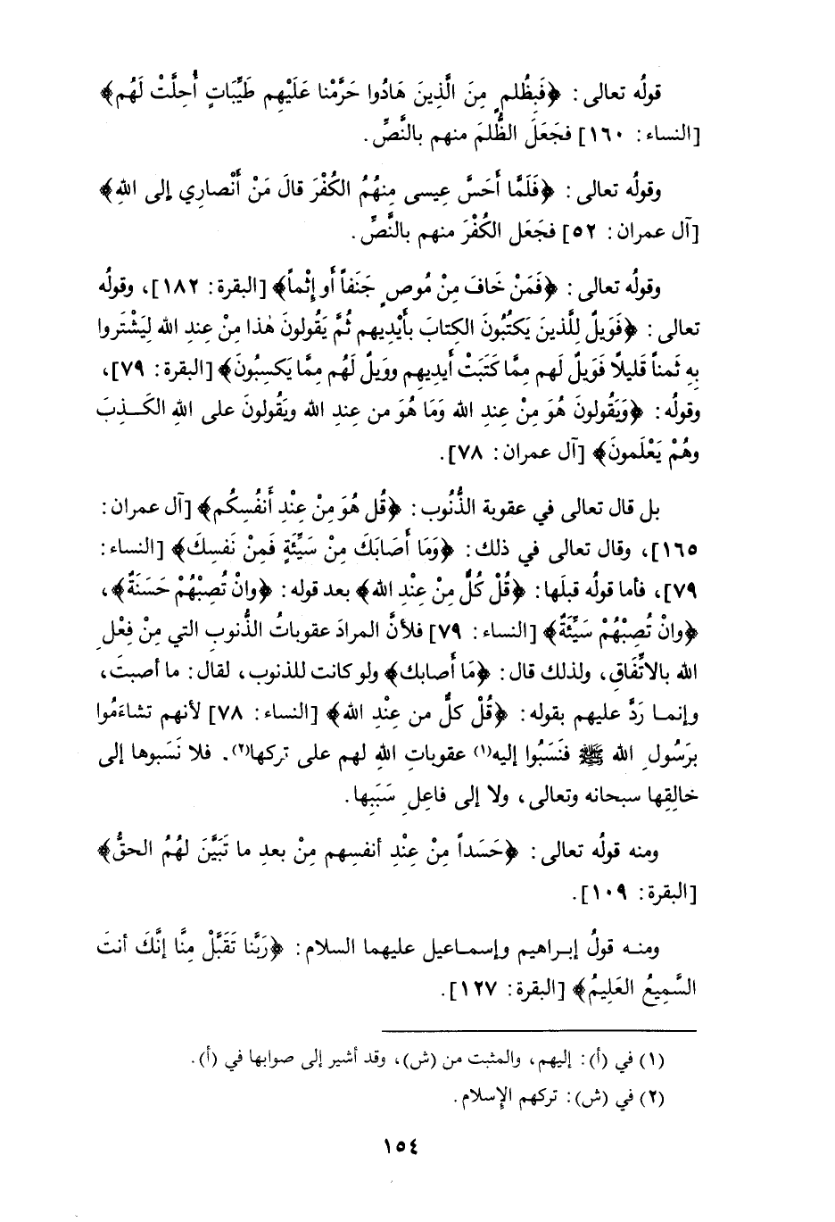بل قال تعالى في عقوبة الذنوب: {قُل هُوَ مِنْ عِنْدِ أنفُسِكُم} [آل عمران: 165]، وقال تعالى في ذلك: {وَمَا أَصَابَكَ مِنْ سَيِّئَةٍ فَمِنْ نَفْسِكَ} [النساء: 79]، فأما قوله قبلها: {قُلْ كُلٌّ مِنْ عِنْدِ الله} بعد قوله: {وإنْ تُصِبْهُمْ حَسَنَةٌ}، {وإنْ تُصِبْهُمْ سَيِّئَةٌ} [النساء: 79] فلأن المراد عقوبات الذنوب التي من فعلِ الله بالاتفاق، ولذلك قال: {مَا أَصابك} ولو كانت للذنوب، لقال: ما أصبت، وإنما رد عليهم بقوله: {قُلْ كلٌّ من عِنْدِ الله} [النساء: 78] لأنهم تشاءموا برسول الله - صلى الله عليه وسلم - فنسبوا إليه (¬1) عقوبات الله لهم على تركها (¬2). فلا نسبوها إلى خالقها سبحانه وتعالى، ولا إلى فاعل سببها.
