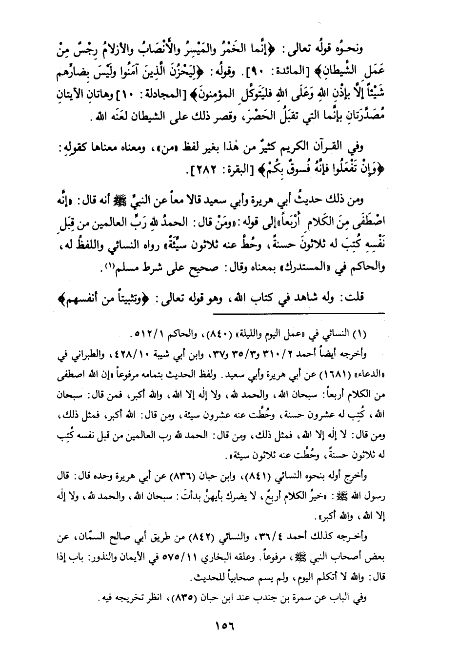 ومن ذلك حديث أبي هريرة وأبي سعيد قالا معاً عن النبي - صلى الله عليه وسلم - أنه قال: " إنه اصطفى من الكلام أربعاً " إلى قوله: " ومن قال: الحمد لله رب العالمين من قِبَلِ نفسه كُتِبَ له ثلاثون حسنةً، وحُطَّ عنه ثلاثون سيِّئَةً " رواه النسائي واللفظ له، والحاكم في " المستدرك " بمعناه وقال: صحيح على شرط مسلم (¬1).