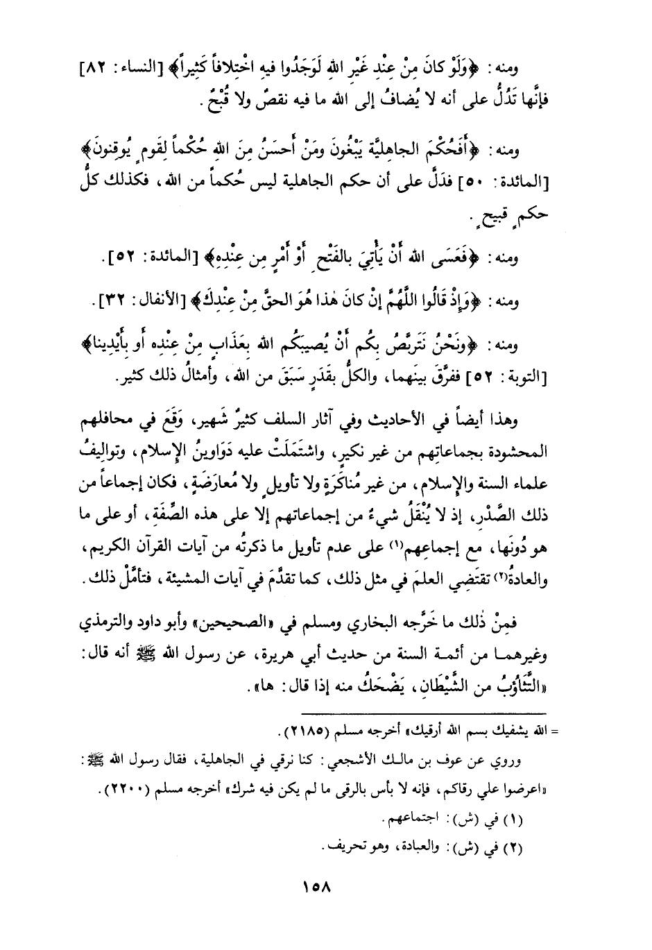 وهذا أيضاً في الأحاديث وفي آثار السلف كثيرٌ شهير، وقع في محافلهم المحشودة بجماعاتهم من غير نكيرٍ، واشتملت عليه دواوين الإسلام، وتواليفُ علماء السنة والإسلام، من غير مُناكرةٍ ولا تأويلٍ ولا معارضةٍ، فكان إجماعاًً من ذلك الصدر، إذ لا يُنْقَلُ شيءٌ من إجماعاتهم إلاَّ على هذه الصفة، أو على ما هو دونها، مع إجماعهم (¬1) على عدم تأويل ما ذكرته من آيات القرآن الكريم، والعادة (¬2) تقتضي العلم في مثل ذلك، كما تقدم في آيات المشيئة، فتأمل ذلك.