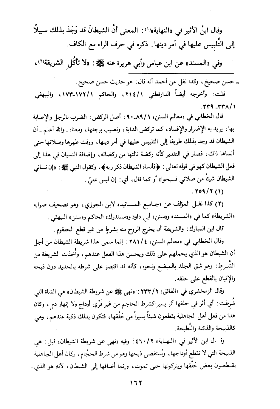 وقال ابن الأثير في " النهاية " 2/ 460: وفيه " نهى عن شريطة الشيطان " قيل: هي الذبيحة التي لا تقطع أوداجها، ويُستقصى ذبحها وهو من شرط الحجَّام، وكان أهل الجاهلية يقطعون بعض حَلْقها ويتركونها حتى تموت، وإنما أضافها إلى الشيطان، لأنه هو الذي =