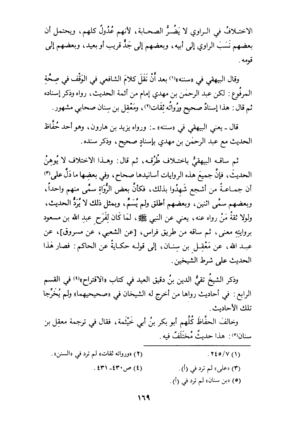 وقال البيهقي في " سننه " (¬1) بعد أن نقل كلام الشافعي في الوقف في صحة المرفوع: لكن عبد الرحمن بن مهدي إمام من أئمة الحديث، رواه وذكر إسناده ثم قال: هذا إسنادٌ صحيح ورُواته ثِقَات (¬2)، ومَعْقِل بن سِنان صحابي مشهور.