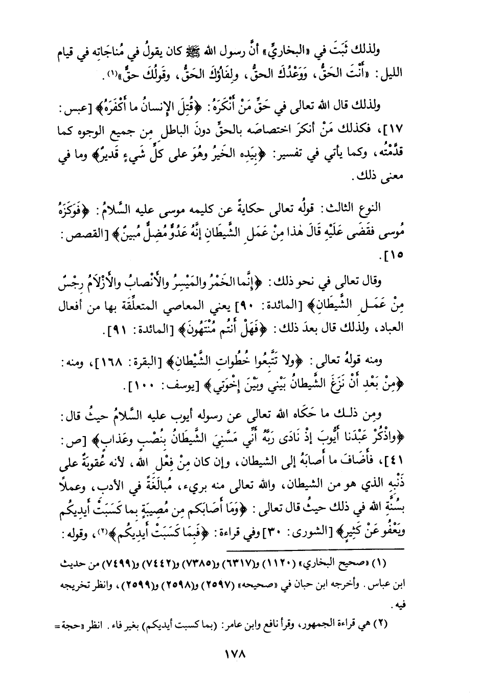 ومن ذلك ما حكاه الله تعالى عن رسوله أيوب عليه السلام حيث قال: {وَاذْكُرْ عَبْدَنَا أَيُّوبَ إِذْ نَادَى رَبَّهُ أَنِّي مَسَّنِيَ الشَّيْطَانُ بِنُصْبٍ وَعَذَابٍ} [ص: 41]، فأضاف ما أصابه إلى الشيطان، وإن كان من فعل الله، لأنه عقوبةٌ على ذَنْبِهِ الذي هو من الشيطان، والله تعالى منه بريء، مبالغةً في الأدب، وعملاً بسنة الله في ذلك حيث قال تعالى: {وَمَا أَصَابَكُمْ مِنْ مُصِيبَةٍ بِمَا كَسَبَتْ أَيْدِيكُمْ وَيَعْفُو عَنْ كَثِيرٍ} [الشورى: 30] وفي قراءة: {فَبِمَا كَسَبَتْ أَيْدِيكُمْ} (¬2)، وقوله:
