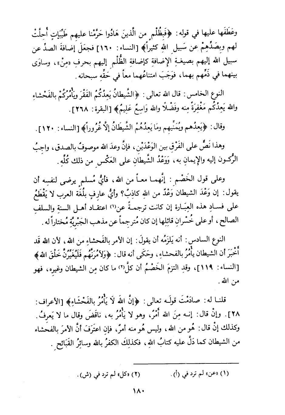 وعلى قول الخصم: إنهما معاً من الله، فأيُّ مُسلمٍ يرضى لنفسه أن يقول: إن وعد الشيطان وعدٌ من الله كاذِبٌ؟ وأيُّ عارفٍ بلُغَة العرب لا يقطع على فساد هذه العبارة إن كانت ترجمةً عن (¬1) اعتقاد أهل السنة والسلف الصالح، أو على خُسْران قائلها إن كان مُترجِماً عن مذهب الجبرية مختاراً له.