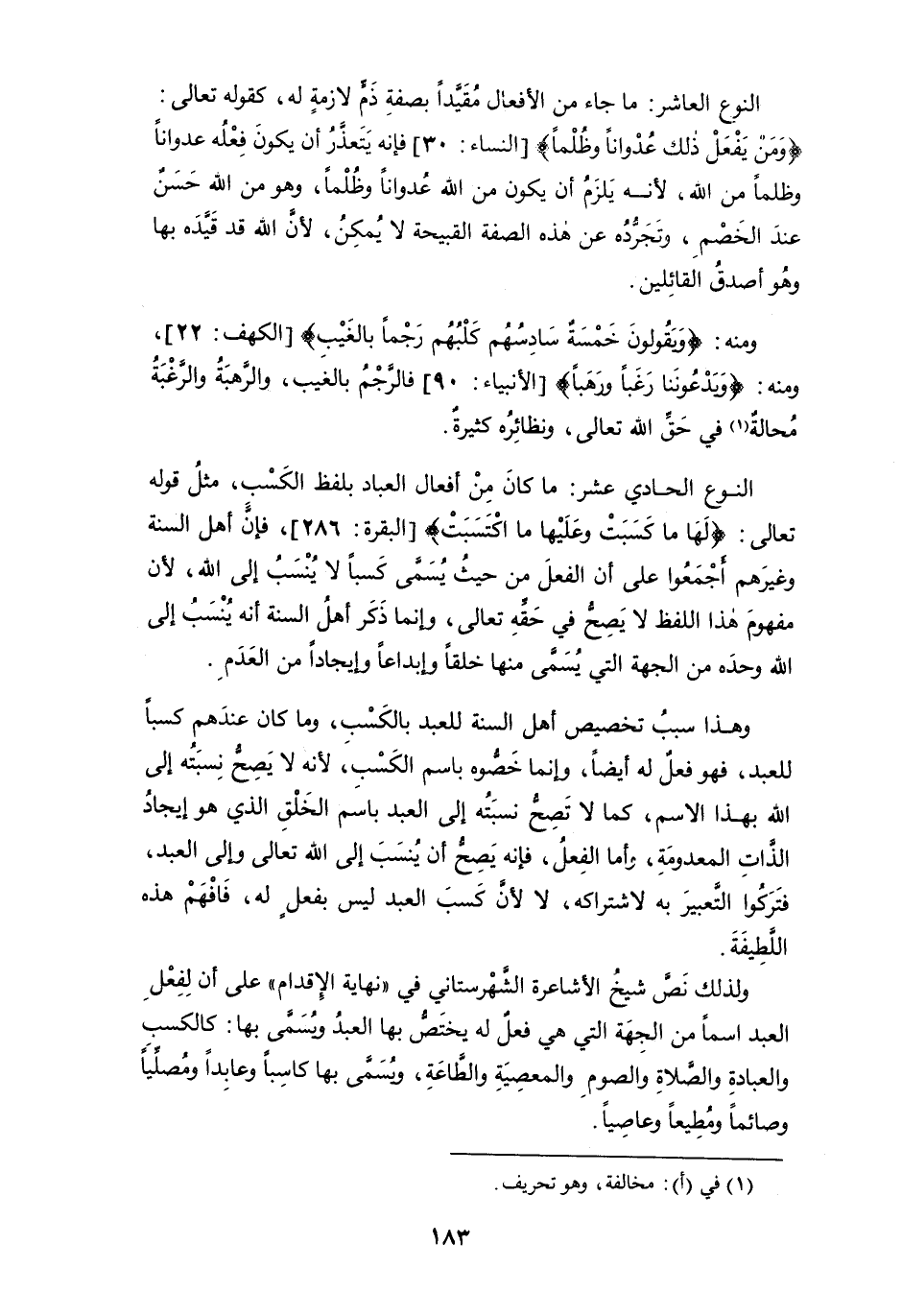 ولذلك نص شيخ الأشاعرة الشهرستاني في " نهاية الإقدام " على أن لِفِعْلِ العبد اسماً من الجهة التي هي فعلٌ له يختصُّ بها العبد ويُسمى بها: كالكسب والعبادة والصلاة والصوم والمعصية والطاعة، ويُسمى بها كاسِباً وعابداً ومُصلِّياً وصائماً ومطيعاً وعاصياً.