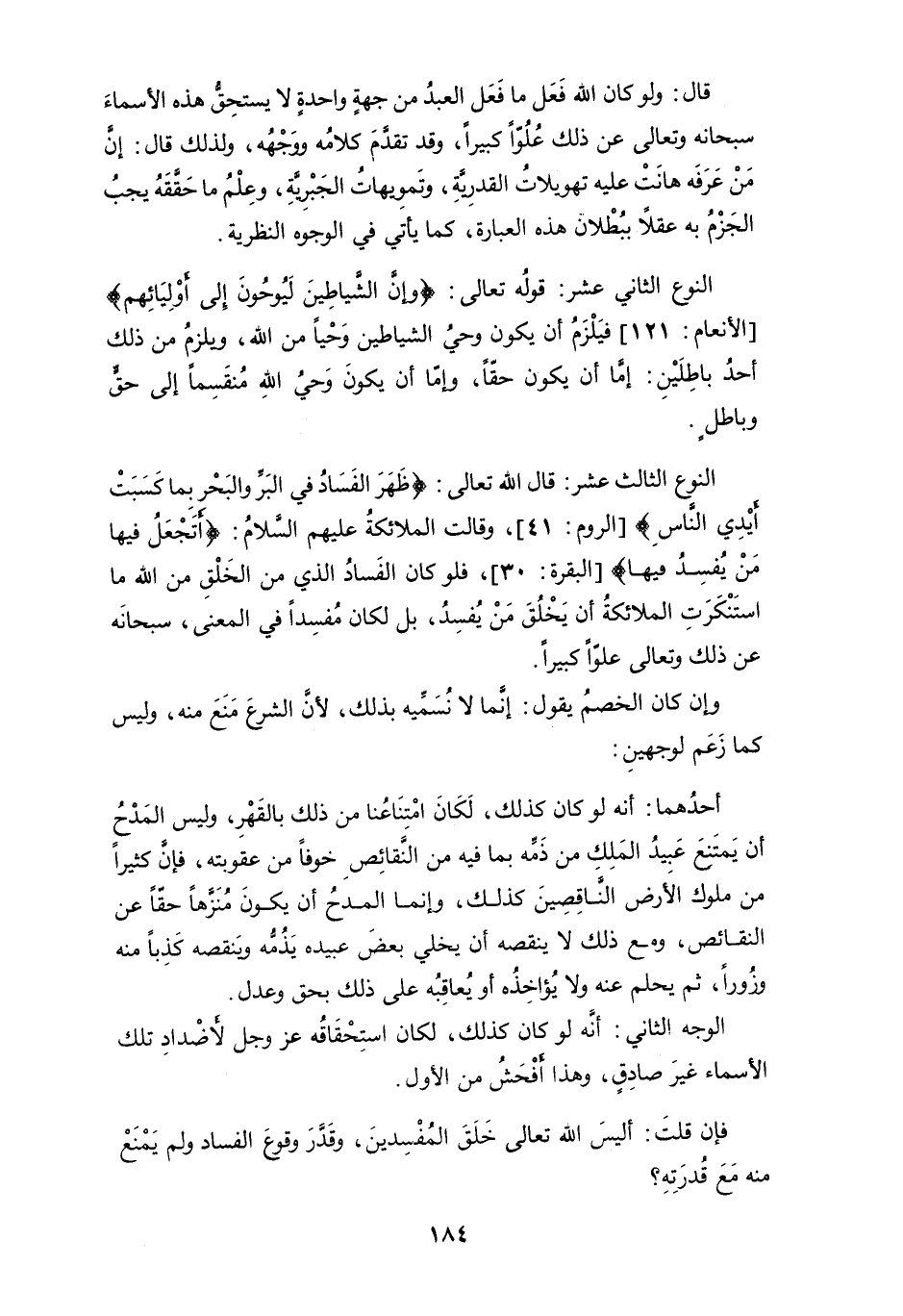 النوع الثالث عشر: قال الله تعالى: {ظَهَرَ الْفَسَادُ فِي الْبَرِّ وَالْبَحْرِ بِمَا كَسَبَتْ أَيْدِي النَّاسِ} [الروم: 41]، وقالت الملائكة عليهم السلام: {أتَجْعَلُ فيها مَنْ يُفسِدُ فيها} [البقرة: 30]، فلو كان الفساد الذي من الخلق من الله ما استنكرتِ الملائكة أن يَخْلُقَ من يُفسِدُ، بل لكان مفسداً في المعنى، سبحانه عن ذلك وتعالى علواً كبيراً.