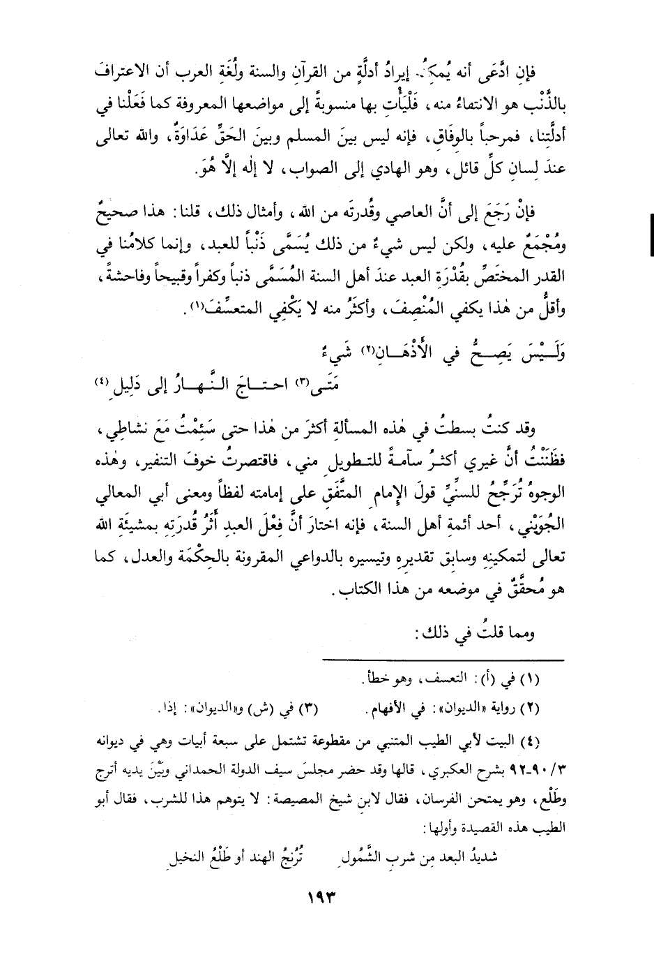 فإن رجع إلى أن العاصي وقدرته من الله، وأمثال ذلك، قلنا: هذا صحيح ومُجْمَعٌ عليه، ولكن ليس شيءٌ من ذلك يُسَمَّى ذنباً للعبد، وإنما كلامنا في القدر المختص بقدرة العبد عند أهل السنة المُسَمَّى ذنباً وكفراً وقبيحاً وفاحشةً، وأقل من هذا يكفي المُنْصِفَ، وأكثر منه لا يكفي المتعسِّف (¬1).