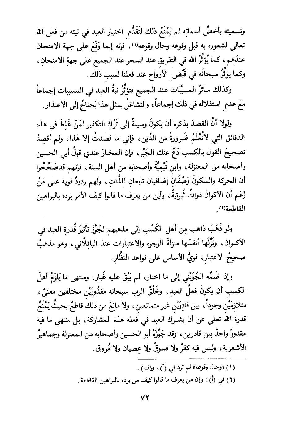 ولو ذهب ذاهب من أهل الكسب إلى مذهبهم لجوز تأثير قُدرة العبد في الأكوان، ونزَّلَها أنفسها منزلة الوجوه والاعتبارات عند الباقلاني، وهو مذهبٌ صحيح الاعتبار، قوي الأساس على قواعد النظار.