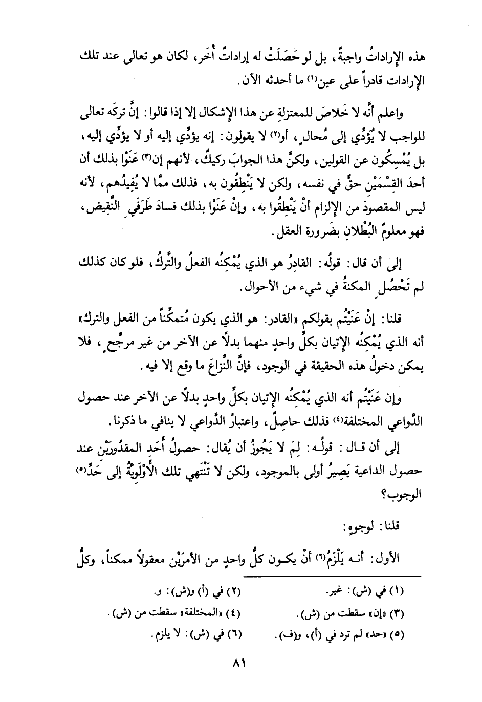 وإن عنيتم أنه الذي يمكنه الإتيان بكل واحدٍ بدلاً عن الآخر عند حصول الدواعي المختلفة (¬4) فذلك حاصِلٌ، واعتبار الدواعي لا ينافي ما ذكرنا.