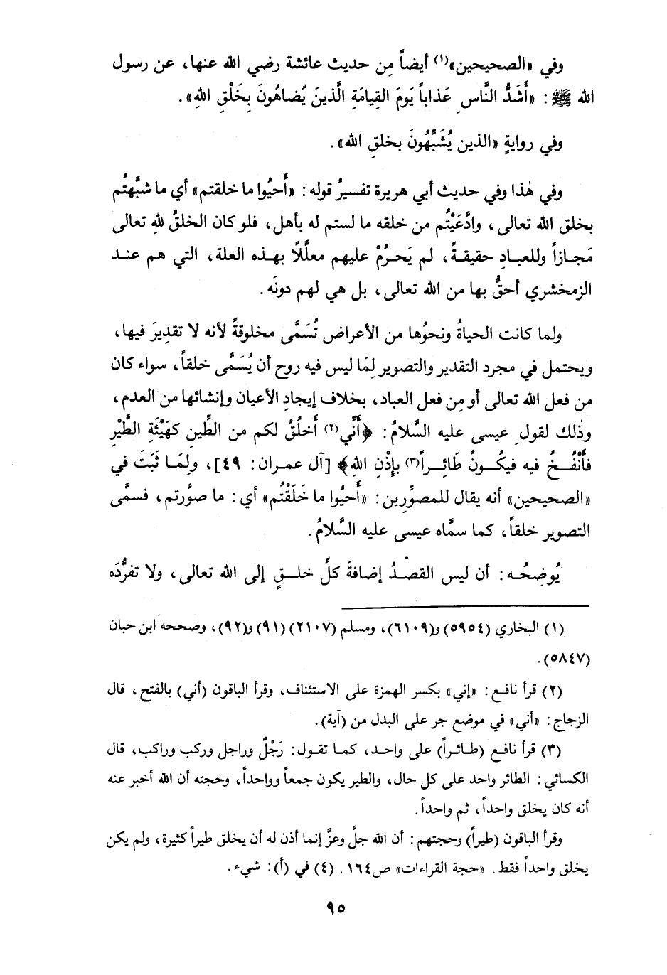 وفي هذا وفي حديث أبي هريرة تفسير قوله: " أحيوا ما خلقتم " أي ما شبَّهتُم بخلق الله تعالى، وادَّعيتم من خلقه ما لستم له بأهل، فلو كان الخلق لله تعالى مجازاً وللعباد حقيقةً، لم يحرم عليهم معلَّلاً بهذه العلة، التي هم عند الزمخشري أحقُّ بها من الله تعالى، بل هي لهم دونه.