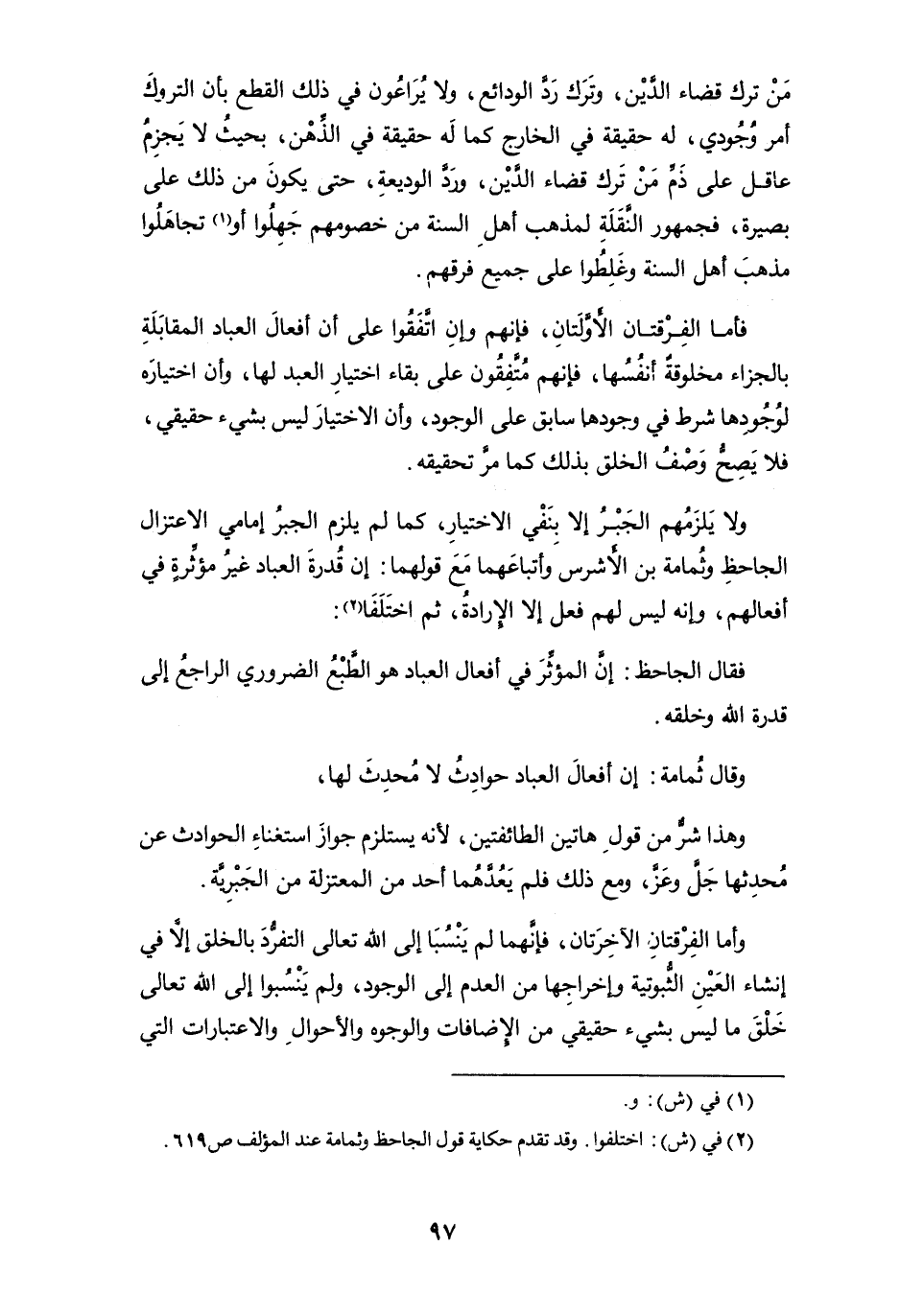 ولا يلزمهم الجبر إلاَّ بنفي الاختيار، كما لم يلزم الجبرُ إمامي الاعتزال الجاحظ وثُمامة بن الأشرس وأتباعهما مع قولهما: إن قدرة العباد غير مؤثرةٍ في أفعالهم، وإنه ليس لهم فعل إلاَّ الإرادة، ثم اختلفا (¬2):