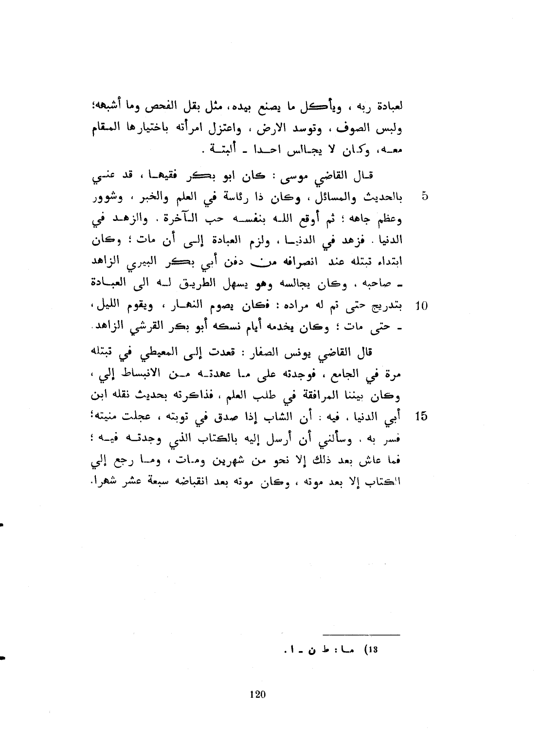 لعبادة ربه، ويأكل ما يصنع بيده مثل بقل الفحص وما أشبه ذلك، ولبس الصوف وتوسّد الأرض، واعتزل امرأته باختيارها المقام معه، وكان لا يجالس أحداً البتة. قال القاضي موسى: كان أبو بكر فقيهاً قد عني بالحديث والمسائل، وكان ذا رئاسة في العلم والخبر، وشوّر وعظم جاهه، ثم أوقع الله تعالى في نفسه حب الآخرة والزهد في الدنيا، فزهد في الدنيا ولزم العبادة الى أن مات. وكان ابتداء تبتله عند انصرافه من دفن أبي بكر البيري الزاهد صاحبه، وكان يجالسه، وهو سهّل الطريق له الى العبادة بتدريج حتى تم له مراده، فكان يصوم النهار ويقوم الليل، حتى مات. وكان يخدمه أيام نسكه أبو بكر القرشي الزاهد، قال القاضي يونس الصفار: فعدت الى المعيطي في تبتله مرة في الجامع فوجدته على ما عهدته من الانبساط إليّ وكان بيننا المرافقة في طلب العلم، فذاكرته بحديث نقله ابن أبي الدنيا في أن الشاب إذا صدق في توبته عجلت منيته، فسرّ به وسألني أن أرسل إليه بالكتاب الذي وجدته فيه، فما عاش بعد ذلك إلا نحو شهرين ومات، وما رجع إليّ الكتاب إلا بعد موته وكان موته بعد انقباضه بسبعة عشر شهراً رحمه الله تعالى.