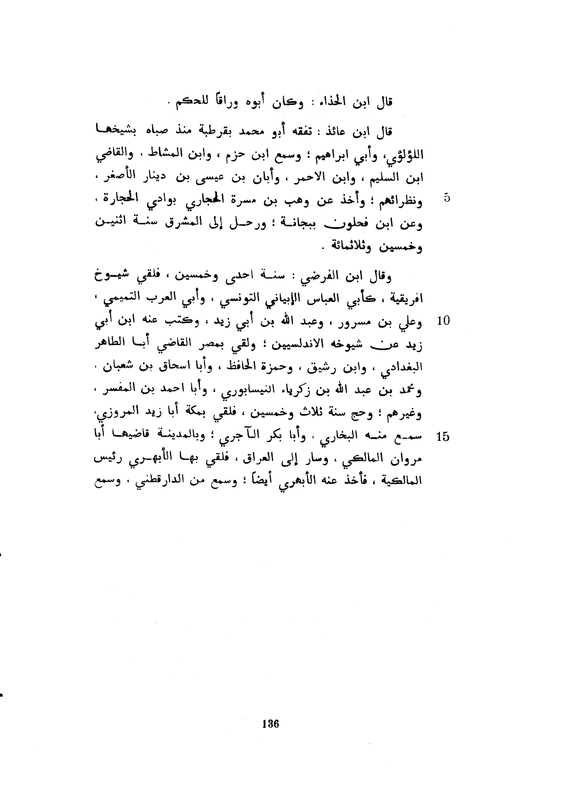 قال ابن الحذاء: وكان أبوه وراقاً للحكم. قال ابن عائد: تفقه أبو محمد بقرطبة منذ صباه بشيخيها اللؤلؤي وأبي ابراهيم وسمع ابن حزم وابن المشاط والقاضي ابن السليم وابن الأحمق وأبان بن عيسى بن دينار الأصغر ونظرائهم. وأخذ عن وهب بن مسرة الحجازي بوادي الحجارة، وعن ابن فحلون ببجانة. ورحل الى المشرق سنة اثنتين وخمسين وثلاثماية. وقال ابن الفرضي: سنة إحدى وخمسين وثلاثماية فلقي شيوخ إفريقية كأبي العباس الإبياني التونسي وأبي العرب التميمي، وعلي بن مسرور، وعبد الله بن أبي زيد رحمه الله. وكتب عنه ابن أبي زيد عن شيوخه الأندلسيين، ولقي بمصر القاضي أبا الطاهر البغدادي، وابن رشيق، وحمزة الحافظ وأبا إسحاق ابن شعبان، ومحمد بن عبد الله بن زكريا النيسابوري وأبا أحمد بن المصف وغيرهم. وحجّ سنة ثلاث وخمسين فلقي بمكة أبا زيد المروزي، سمع منه البخاري وأبا بكر الآجري. وبالمدينة قاضيها أبا مروان المالكي، وسار الى العراق فلقي بها الأبهري رئيس المالكية، وأخذ عنه الأبهري أيضاً. وسمع من الدارقطني، وسمع