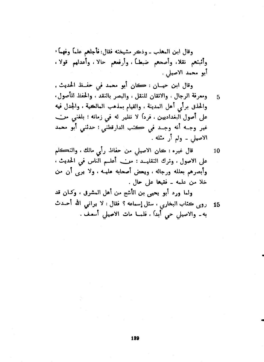 وقال ابن المهلب: وذكر مشيخته، فقال: فأجلّهم علماً، وفقهاً، وأثبتهم نقلاً، وأصحهم ضبطاً، وأرفعهم حالاً، وأعدلهم قولاً، أبو محمد الأصيلي. وقال ابن حيان: كان أبو محمد في حفظ الحديث، ومعرفة الرجال، والإتقان للنقل، والبصر بالنقد، والحفظ للأصول، والحذق برأي أهل المدينة، والقيام بمذهب المالكية، والجدل فيه على أصول البغداديين، فرداً لا نظير له في زمانه. بلغني من غير واحد أنه وجد في كتب الدارقطني: حدثني أبو محمد الأصيلي ولم أرَ مثله. قال غيره: كان الأصيلي من حفاظ رأي مالك، والمتكلم على الأصول وترك التقليد، من أعلم الناس في الحديث، وأبصرهم بعلله ورجاله، ويحض أصحابه عليه، ولا يرى أن من خلا من علمه فقيهاً على حال، ولما ورد أبو يحيى ابن الأشج من أهل المشرق وكان قد روى كتاب البخاري سئل إسماعه فقال: لا يراني الله أحدث به والأصيلي حي أبداً. فلما مات الأصيلي أسعف،