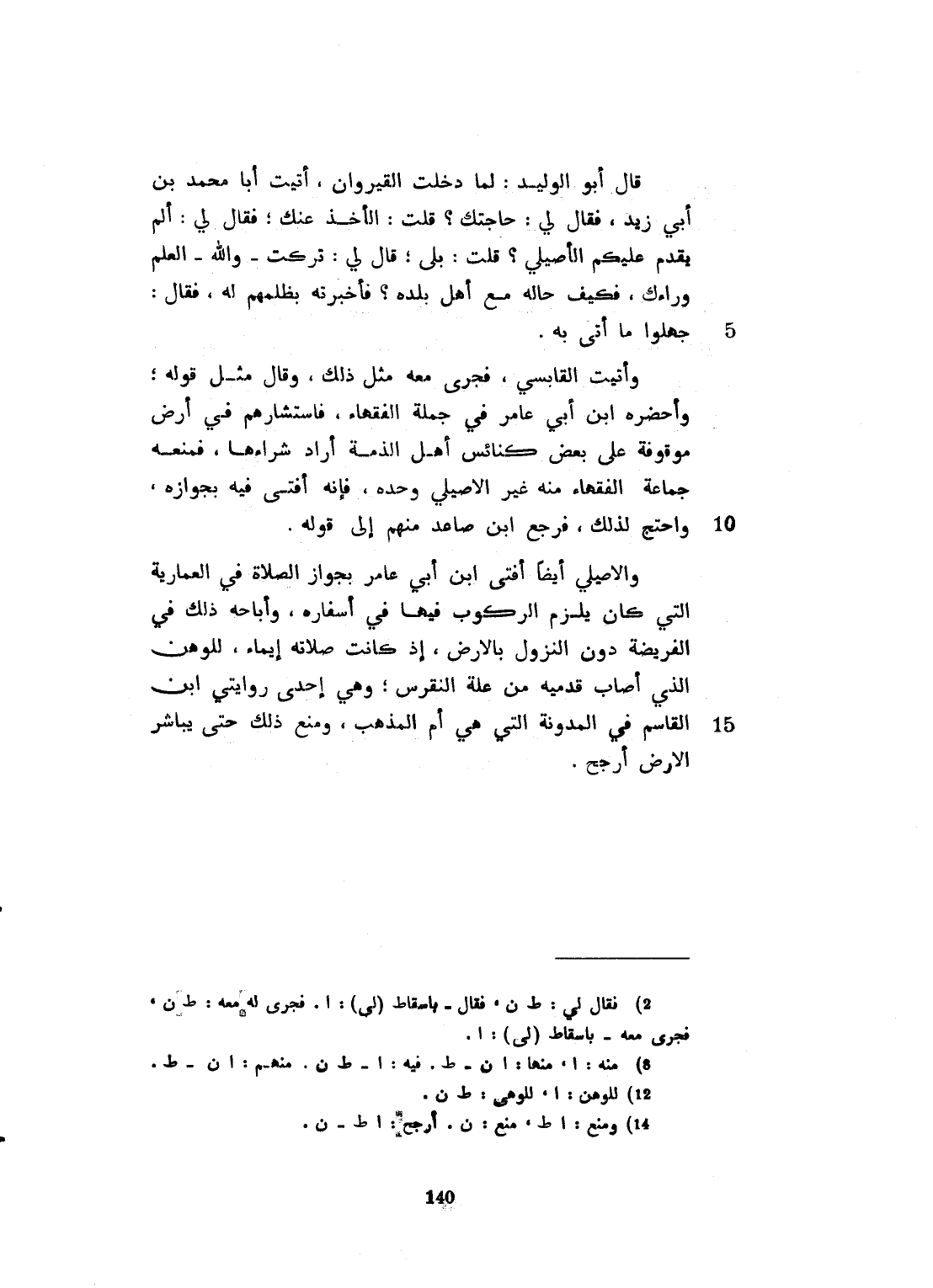 قال أبو الوليد: لما دخلت القيروان أتيت أبا محمد ابن أبي زيد فقال لي: ما حاجتك؟ قلت: الأخذ عنك. فقال لي: ألم يقدم عليك الأصيلي؟ قلت: بلى، قال لي: تركت والله العلم وراءك، فكيف حاله مع أهل بلده؟ فأخبرته بظلمهم له، قال: جهلوا ما أتى به. وأتيت القابسي فجرى لي معه مثل ذلك. وقال لي مثل قوله. وأحضره ابن أبي عامر في جملة الفقهاء، فاستشارهم في أرض موقوفة على بعض كنائس أهل الذمة، أراد شراءها، فمنعه جماعة الفقهاء منها، غير الأصيلي وحده فإنه أفتاه بجوازه، واحتج لذلك. فرجع ابن صاعد منهم الى قوله. والأصيلي أيضاً أفتى لابن أبي عامر بجواز الصلاة، في العمارية التي كان يلزم الركوب فيها في أسفاره، وإباحة ذلك في الفريضة، دون النزول بالأرض إذا كانت صلاته إيماء للوجع الذي أصاب قدميه من علة النقرس، وهي إحدى روايتي ابن القاسم عن مالك. ولم يرَ غيره هذه الفتيا. ورأي رواية ابن القاسم عن مالك في المدونة، التي هي أم المذهب منع ذلك حتى يباشر الأرض،