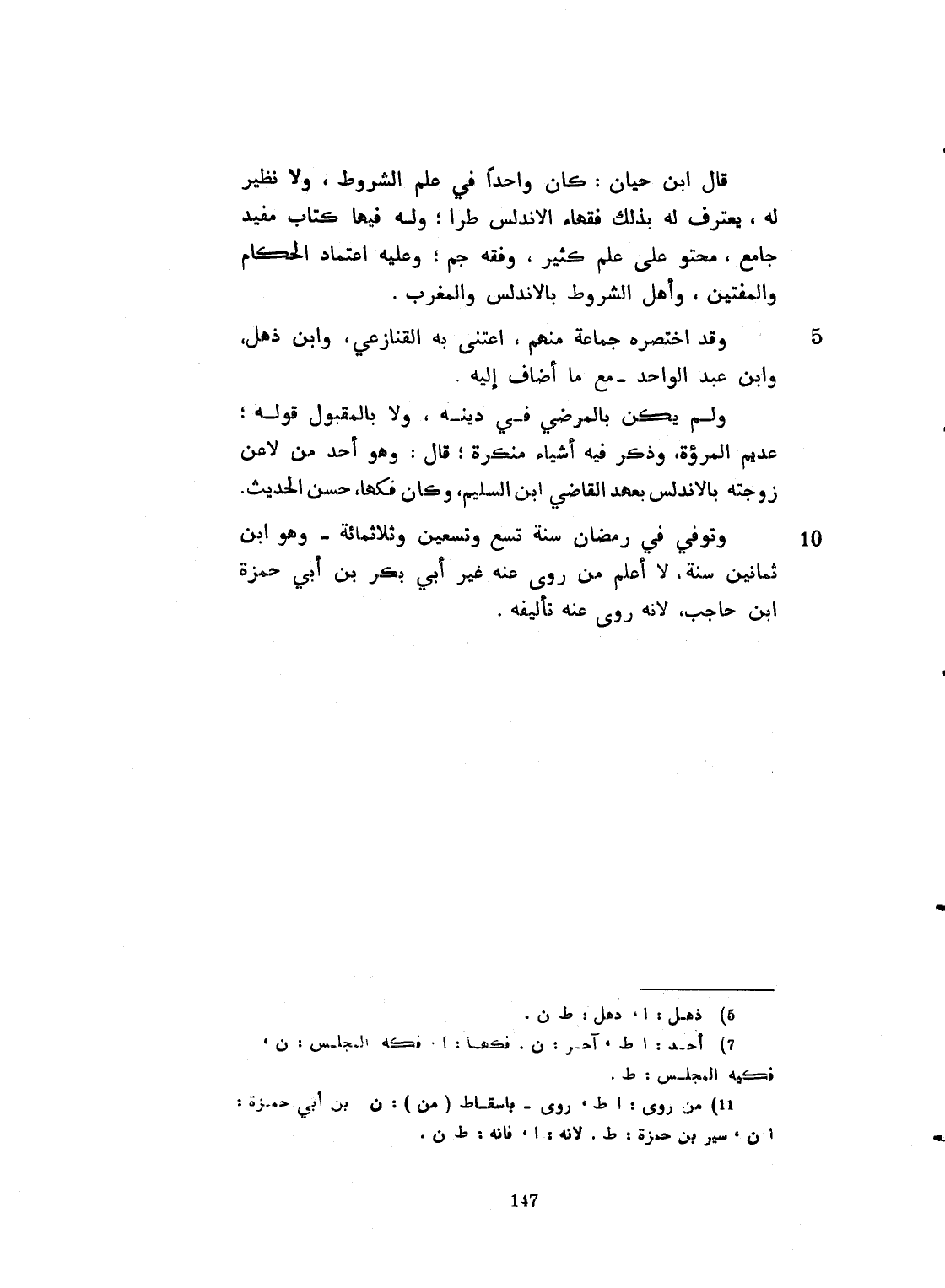 قال ابن حيان: كان واحد عصره في علم الشروط لا نظير له، يعترف له بذلك فقهاء الأندلس. وله فيها كتاب مفيد جامع محتو على علم كثير وفقه جم، وعليه اعتماد الحكام والمفتين، وأهل الشروط بالأندلس والمغرب. إذ سلك فيها الطريق الواضح، وقد اختصره جماعة منهم. اعتنى به منهم القنازعي، وابن ذهل، وابن عبد الواحد، مع ما أضاف إليه. ولم يكن بالمرضي في دينه، ولا بالمقبول قوله، عديم المروءة. وذكرت فيه أشياء منكرة. وهو أحد من لاعن زوجته بالأندلس بعهد القاضي ابن السليم. وكان فكهاً حسن الحديث. وتوفي في رمضان سنة تسع وتسعين وثلاثماية. وهو ابن ثمانين سنة. ولا أعلم روى عنه غير أبي بكر ابن سيرين وحمزة بن حاجب فإنه روى عنه تأليفه.
