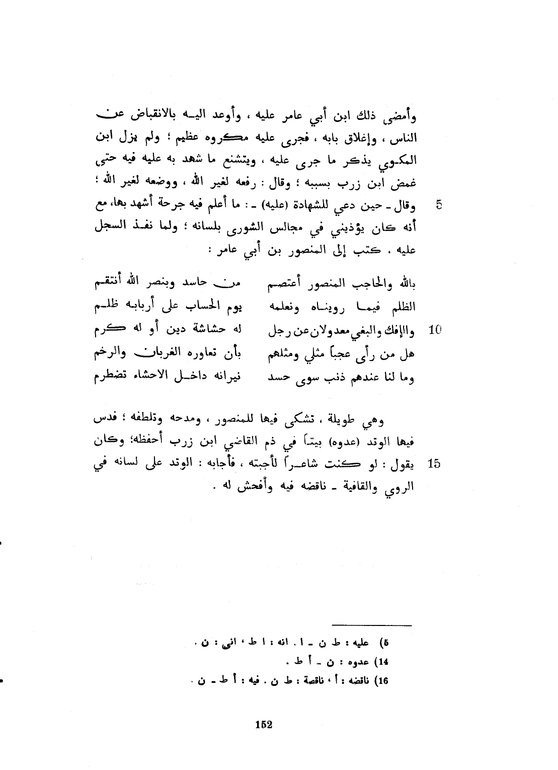 وهي طويلة، تشكى فيها للمنصور، مدحه، وتلطفه، فدس فيه الوتد - عدوه - بيتاً في ذم القاضي ابن زرب أحفظه، وكان يقول: لو كنت شاعراً لأجبته. فأجابه الوتد على لسانه في الروي والقافية، ناقضه فيها وأفحش له.