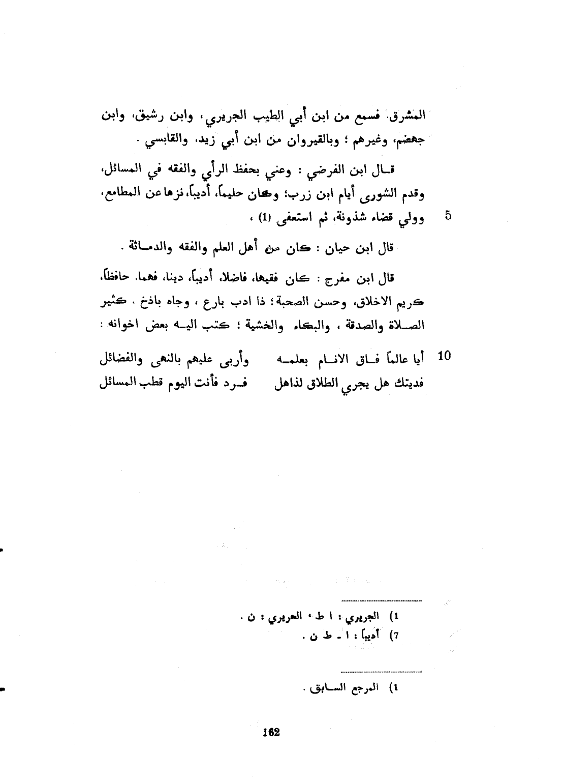 وبالقيروان من ابن أبي زيد، والقابسي، رحمهما الله. قال ابن الفرضي: عني بحفظ الرأي والتفقه في المسائل، وقدم للشورى أيام ابن زرب. وكان حليماً، أديباً، نزيهاً عن المطامع. ووليَ قضاء شذونة. ثم استعفى. قال ابن حيان: كان من أهل العلم، والفقه، والديانة. قال ابن مفرج: كان فقيهاً فاضلاً، ديّناً فهماً، حافظاً كريم الأخلاق، حسن الصحبة، ذا أدب بارع، وجاه باذخ، كثير الصلاة والصدقة، والبكاء والخشية. كتب إليه بعض إخوانه: