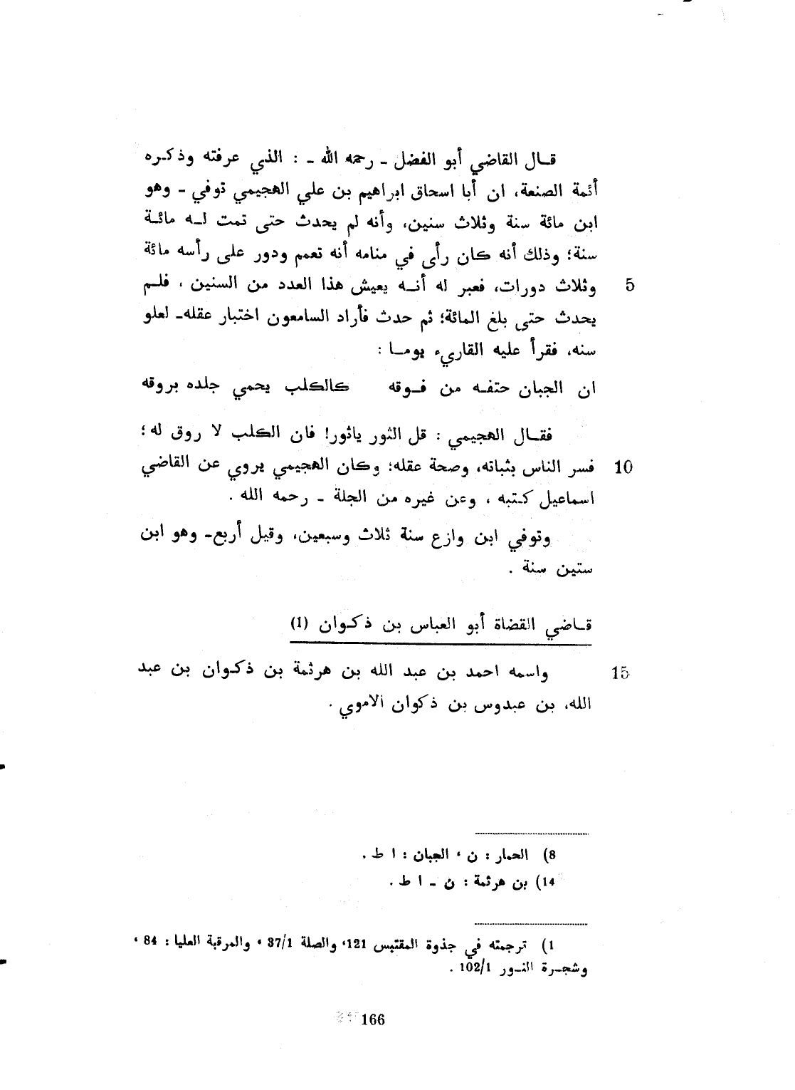 قال القاضي أبو الفضل رحمه الله: الذي عرفته وذكره أئمة الصنعة، أن أبا إسحاق ابراهيم ابن علي العجيمي، توفي وهو ابن ماية سنة وثلاث سنين، وأنه لم يحدث حتى تمت له ماية سنة، وذلك أنه كان رأى في منامه أنه تعمّم، ودور على رأسه ماية وثلاث دورات. فعبر له أنه يعيش هذا القدر من السنين. فلم يحدث حتى بلغ المائة. ثم حدث فأراد السامعون اختبار عقله بعلو سنّه، فقرئ عليه القارئ يوماً:
