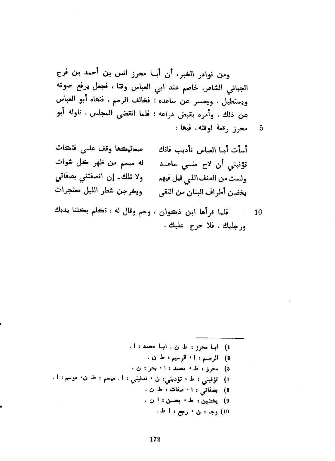 ومن نوادر الخبر أن أبا بحر أنس بن أحمد بن فرج الجياني الشاعر، خاصم عند أبي العباس وقتاً فجعل يرفع صوته، ويستطيل، ويحسر عن ساعديه، بخلاف الرسم، فنهاه أبو العباس عن ذلك وأمره بقبض ذراعه. فلما انقضى المجلس ناوله أبو محمد رقعة لوقته فيها:
