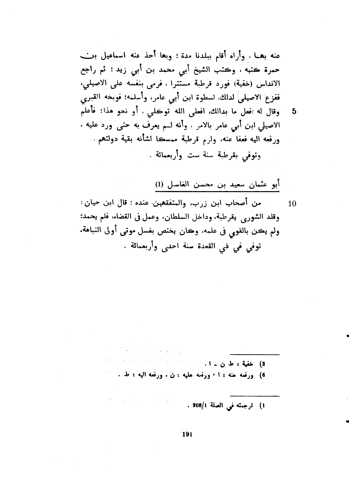 عنه بها، وأراه أقام ببلدنا مدة، وبها أخذ عنه اسماعيل بن حمزة كتبه وكتب الشيخ أبي محمد ابن أبي زيد رحمه الله، ثم راجع الأندلس خفية فورد قرطبة متستراً، فرمى بنفسه على الأصيلي، ففزع الأصيلي لذلك، لسطوة ابن أبي عامر فوبخه القبري وقال له: افعل ما بدا لك فعلى الله توكيلي أو نحو هذا، فأعلم الأصيلي ابن أبي عامر بالأمر وأنه لم يعرف به حتى ورد عليه ورفعه إليه، فعفا عنه ولزم قرطبة ممسكاً لسانه بقية دولتهم، وتوفي بقرطبة سنة ست وأربعماية.