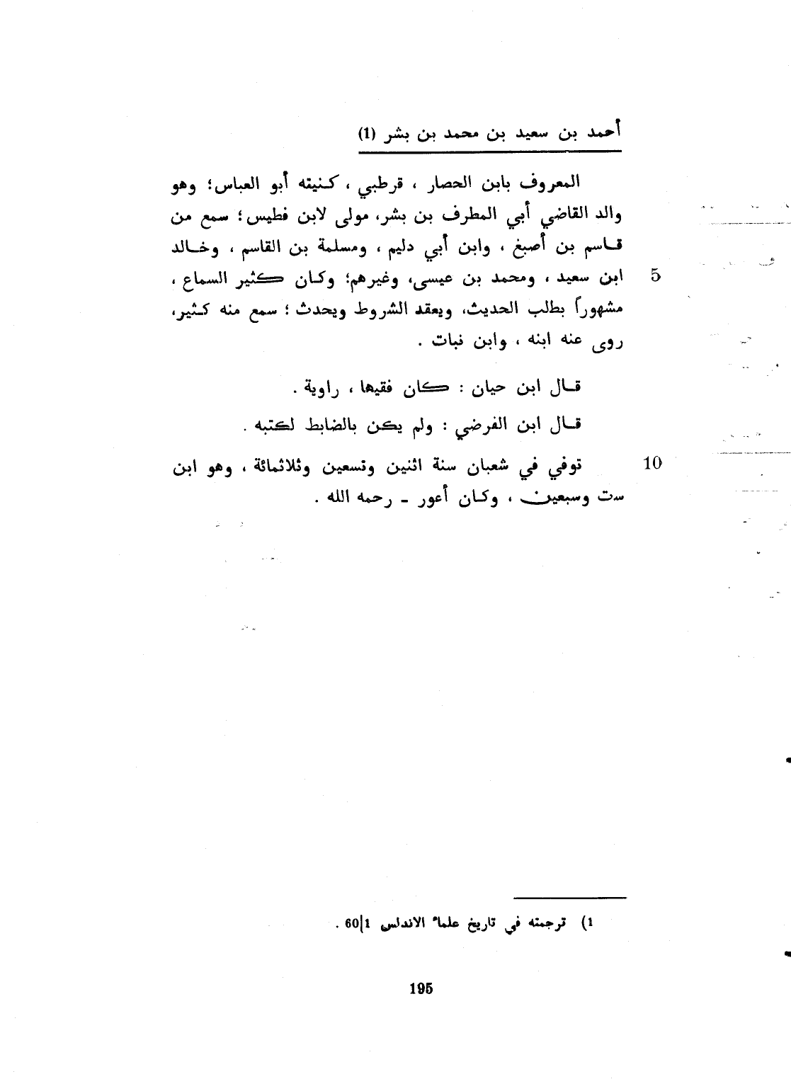 المعروف بابن الحصار. قرطبي كنيته أبو العباس. وهو والد القاضي أبي المطرف بن بشر، مولى لابن فطيس، سمع من قاسم بن أصبغ، وابن أبي دليم، ومسلمة بن قاسم، وخالد بن سعيد، ومحمد بن عيسى وغيرهم. وكان كثير السماع مشهوراً بطلب الحديث يعقد الشروط، ويفتي ويحدث. سمع منه كثير روى عنه ابنه وابن نبات. قال ابن حيان كان فقيهاً راوية. قال ابن الفرضي: ولم يكن بالضابط لكتبه. توفي في شعبان سنة اثنتين وتسعين وثلاثماية. وهو ابن وست وأربعين وكان أعور. رحمه الله.