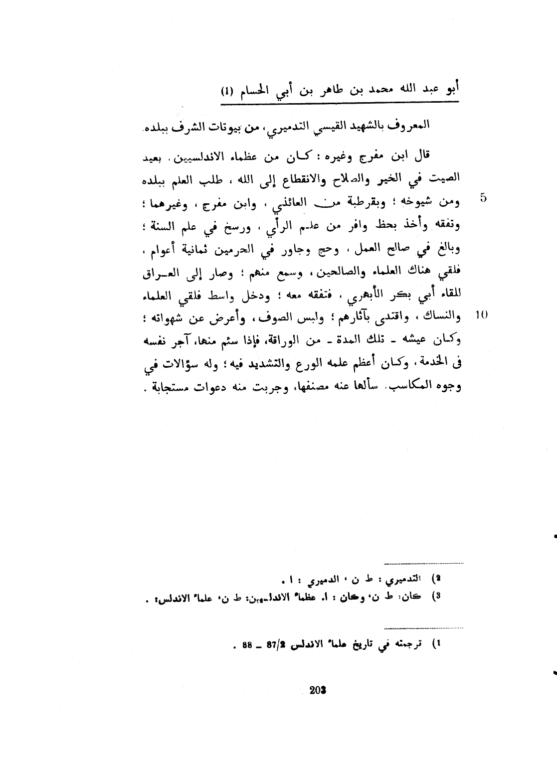 المعروف بالشهيد القيسي. التدميري. من بيوتات الشرف ببلده. قال ابن مفرج وغيره: وكان من عظماء الأندلسيين، بعيد الصيت في الخير والصلاح والانقطاع الى الله تعالى. طلب العلم ببلده، ومن شيوخه. وبقرطبة من العابدي، وابن مفرج وغيرهما وتفقه وأخذ بحظ وافر من علم الرأي، ورسخ في علم السنة. وبالغ في صالح العمل، وحجّ وجاور في الحرمين ثمانية أعوام. فلقي هناك العلماء والصالحين، وسمع منهم وصار الى العراق للقاء أبي بكر الأبهري. فتفقه معه ودخل واسط، فلقي العلماء والنساك، واقتدى بآثارهم، ولبس الصوف، وأعرض عن شهواته. وكان عيشه تلك المدة من الوراقة، فإذا سئم منها أجر نفسه في الخدمة. وكان أعظم علمه الورع والتشدد فيه، وله سؤالات في وجوه المكاسب، سألها عنه مصنفها وجريت منه دعوات مستجابة.