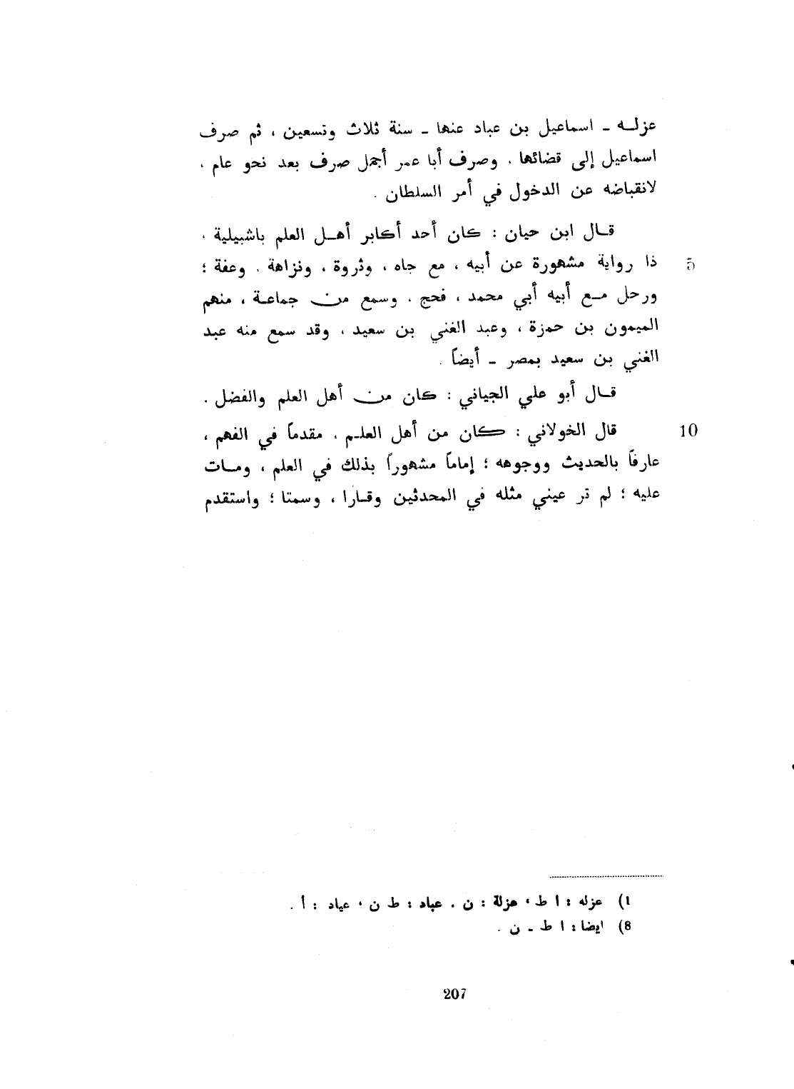 مرحباً بك قد سألت الله عز وجلّ أن يرينيك قبل الموت. فقد فعل وأحسب أني مقبوض، فأنشدك الله أن تقيم عليّ تشهدني وتقوم بشأني. فإذا مت فاغسلني ونقني وجهزني وحنطني وطيبني وكفنّي في ثلاثة أثواب غير مخيطة. قد أعددتها ولا تعممني وضعني فوق نعشي، وتقدم بالصلاة عليّ، واجتهد في الدعاء الى الدائم القائم، الحي الذي لا يموت. واسأله أن يجمعني وإياك في جواره برحمته ورضوانه حيث أنا من الغربة. وتعم في النعمة، ثم اتركني لولدي وأهلي وجيراني يتولون دفني. وانهض أنت الى موضعك مصحوباً بالخير مشيعاً بالسلامة. واستودعتك الله تعالى خير مستودع. قال فشهدت موته ولقنته الشهادة، وهو غير مؤتل في تكريرها الى أن زهقت نفسه. فقمت بأمره، وكانت سنة ثمان وسبعين وثلاثماية. رحل مع ابنه محمد فحجّ، وسمع من جماعة منهم الميمون بن حمزة وعبد الغني بن سعيد. وقد سمع من عبد الغني سعيد بمصر أيضاً. قال أبو علي الجياني: كان من أهل العلم والفضل، قال الخولاني: كان من أهل العلم مقدماً في الفهم عارفاً بالحديث ووجوهه، إماماً مشهوراً بذلك، سيما في العلم. ومات عليه. لم ترَ عيني مثله في المحدثين، وقاراً وسمتاً. استقدم