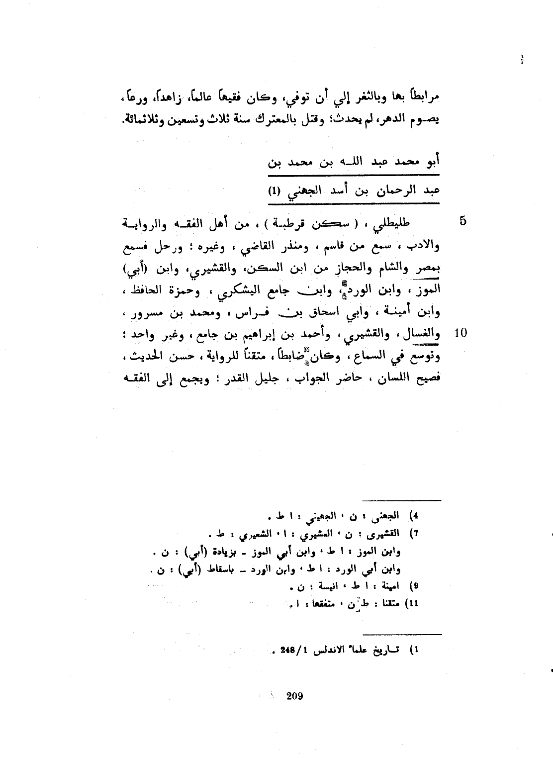 طليطلي. سكن قرطبة. من أهل الفقه والرواية والأدب. سمع من قاسم بن منذر القاضي وغيره. رحل فسمع بمصر والشام والحجاز من أبي عباس ابن السكن، وابن أبي الجوز، وابن أبي الورد، وابن جامع السكري، وحمزة الحافظ، وابن أسيد، وابن إسحاق، وابن فراس محمد بن سرور الغسال والقشيري، وأحمد بن ابراهيم بن جامع، وغير واحد. توسع في السماع، وكان ضابطاً متفنناً للرواية، حسن الحديث، فصيح اللسان، حاضر الجواب، جليل القدر. ويجمع الى الفقه