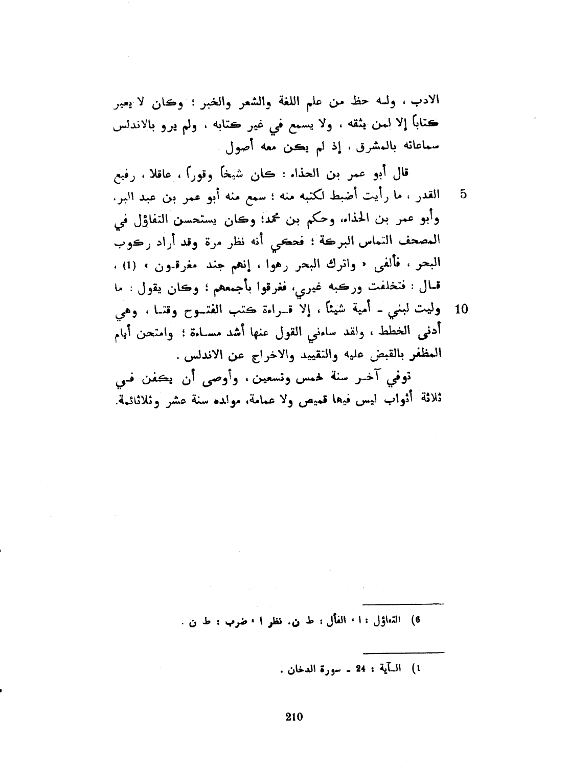 الأدب. وله حظ من علم اللغة والشعر. وكان لا يغير كتاباً إلا بمشقة، ولا يسمع في غير كتابه. ولم يرو بالأندلس سماعاته بالمشرق، إذ لم يكن معه أصول قال أبو عمر ابن الحذاء: كان شيخاً وقوراً فاضلاً رفيع القدر. ما رأيت أضبط لكتبه منه. حدث عنه أبو عمر ابن عبد البر، وأبو عمر ابن الحذاء وحكم بن محمد. وكان يستحسن التفاؤل في المصحف لالتماس البركة. يحكى أنه صرف مدة، وقد أراد ركوب البر فألفى: واترك البحر رهواً إنهم جند مغرقون. قال: فتخلفت وركب غيري فغرقوا بأجمعهم. وكان يقول ما وليت لبني أمية إلا قراءة كتب الفتوح وقتاً، وهي أدنى الحفظ. ولقد أساءني القول عنها أشد مساءة. وامتحن أيام ابن المظفر بالغيرة عليه والتقييد والإخراج عن الأندلس. توفي في آخر سة خمس وتسعين وأوصى أن يكفن في ثلاثة أثواب ليس فيه قميص ولا عمامة. مولده رحمه الله سنة عشر وثلاثماية. رضي الله عنه.