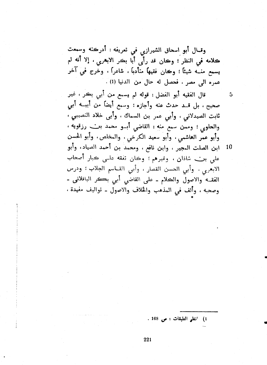 وقال أبو إسحاق الشيرازي في تعريفه: أدركته وسمعت كلامه في النظر قال: وقد رأى أبا بكر الأبهري إلا أنه لم يسمع منه شيئاً، وكان فقيهاً متأدباً شاعراً. وخرج في آخر عمره الى مصر فحصل له حال من الدنيا. قال الفقيه أبو الفضل قوله لم يسمع من أبي بكر غير صحيح، بل حدث عنه وأجازه وسمع أيضاً من أبيه عن أبي ثابت الصيدلاني، وابن عمر بن السماك، وأبي خالد النصيبي والحاوي. وممن سمع منه أيضاً القاضي أبو محمد بن زرقونه، وأبو عم الهاشمي، وأبو سعيد الكرخي، والمخلص، وأبو الحسن ابن الصلت، والمجد، وابن نافع، ومحمد بن أحمد الصياد، وأبو علي ابن شاذان وغيرهم. وكان تفقهه على كبار أصحاب الأبهري: أبي الحسن ابن القصار، وأبي القاسم ابن الجلاب، ودرس الفقه والأصول والكلام على القاضي أبي بكر الباقلاني وصحبه وألف في المذهب والخلاف والأصول تواليف بديعة مفيدة