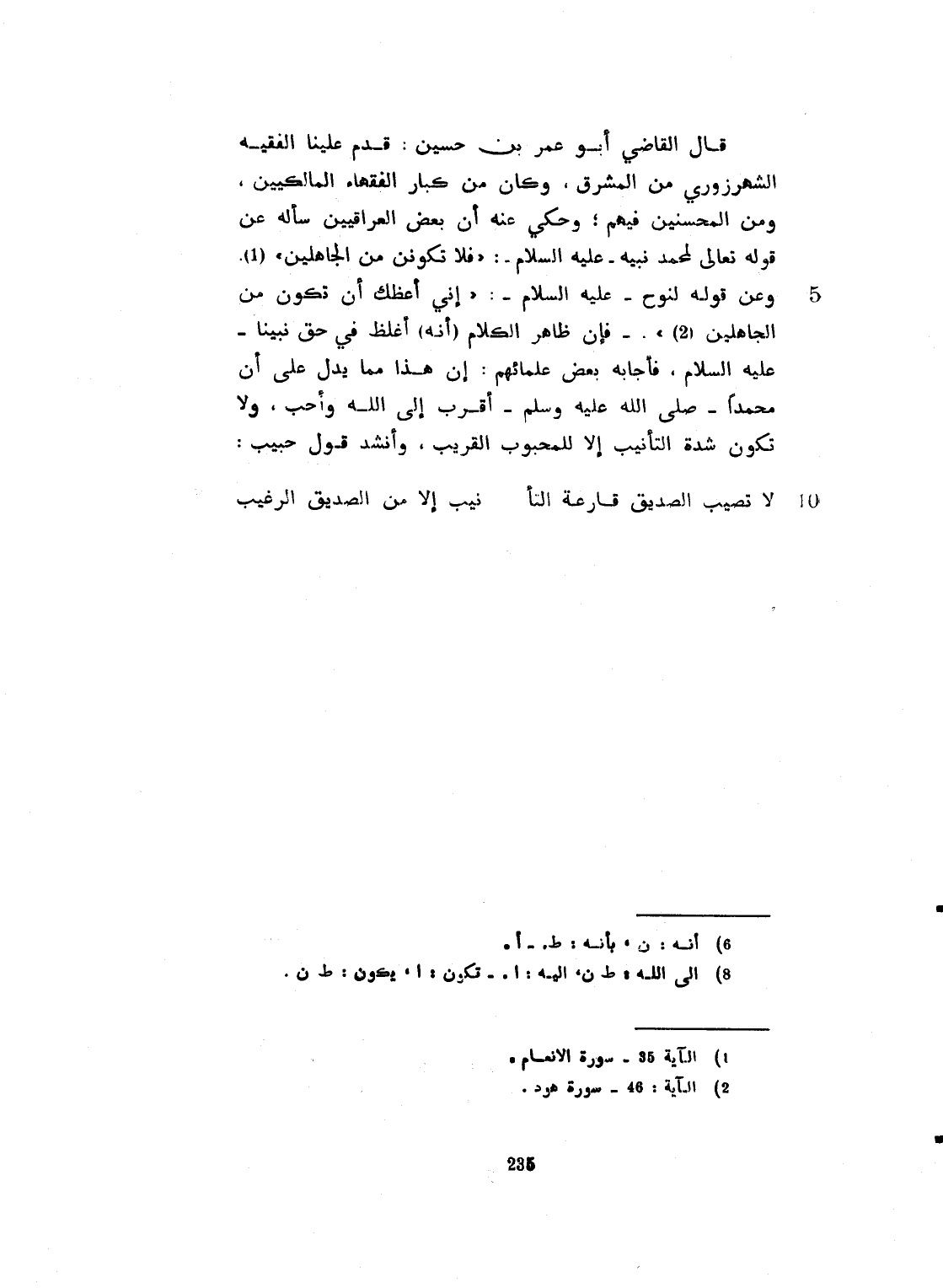 قال القاضي أبو عمر ابن حسين: قدم علينا الفقيه الشيخ الشهرزوري، من المشرق. وكان من كبار الفقهاء المالكيين، ومن المحسنين فيهم. وحكي عنه أن بعض العراقيين سأل عن قوله تعالى، لمحمد نبيّه عليه السلام: " فلا تكونن من الجاهلين ". وعن قوله تعالى لنوح: " إني أعظُك أن تكون من الجاهلين ". فإن ظاهر الكلام، أنه أغلظ في حق نبيّنا صلى الله عليه وسلم. فأجابه بعض علمائهم: إن هذا مما يدل على أن محمداً صلى الله عليه وسلم، أقرب الى الله وأحبّ. ولا يكون شدة التأديب إلا للمحبوب القريب، وأنشد:
