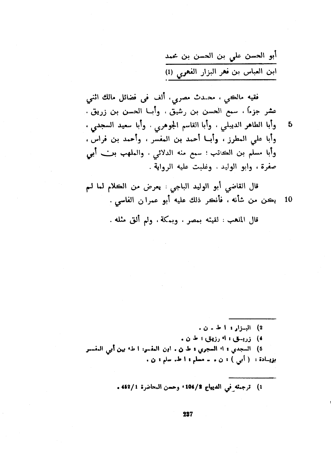 فقيه مالكي محدث مصر. ألّف في فضائل مالك رضي الله عنه اثني عشر جزءاً. سمع الحسن بن رشيق وأبا الحسن ابن زريق وأبا الطاهر الدبيلي وأبا القاسم الجوهري، وأبا سعيد السحري، وأبا علي المطرّزي، وأبا أحمد بن اليسر، وأحمد بن فراس، وأبا مسلم الكاتب، سمع منه الدلائي، والمهلب بن أبي صفرة، وابن الوليد، وغلبت عليه الرواية. قال القاضي أبو الوليد الباجي: تعرّض من الكلام لما لم يكن من شأنه، فأنكر ذلك عليه. وقال أبو عمران الفاسي: تفقّه بمصر وبمكة، ولم ألقَ مثله.