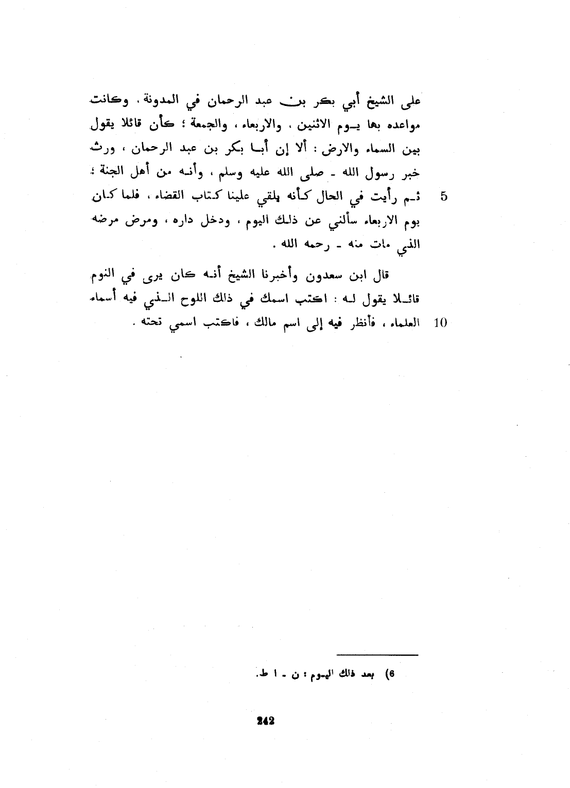على الشيخ أبي بكر بن عبد الرحمن في المدونة، وكانت مواعيده بها يوم الإثنين والأربعاء والجمعة. قائلاً يقول بين السماء والأرض: إلا أن أبا بكر بن عبد الرحمن، ورث خبر رسول الله صلى الله عليه وسلم، وأنه من أهل الجنة. ثم رأيت في الحال كأني يلقى علينا كتاب القضاء. فلما كان يوم الأربعاء، سألني عن ذلك بعد ذلك اليوم. ودخل داره ومرض مرضه الذي مات فيه، رحمه الله. قال ابن سعدون: أخبرنا الشيخ أنه كان يرى في النوم كأن قائلاً يقول له: اكتب اسمك في ذلك اللوح، الذي فيه أسماء العلماء، فانظر فيه الى اسم مالك. فأكتب اسمي تحته.