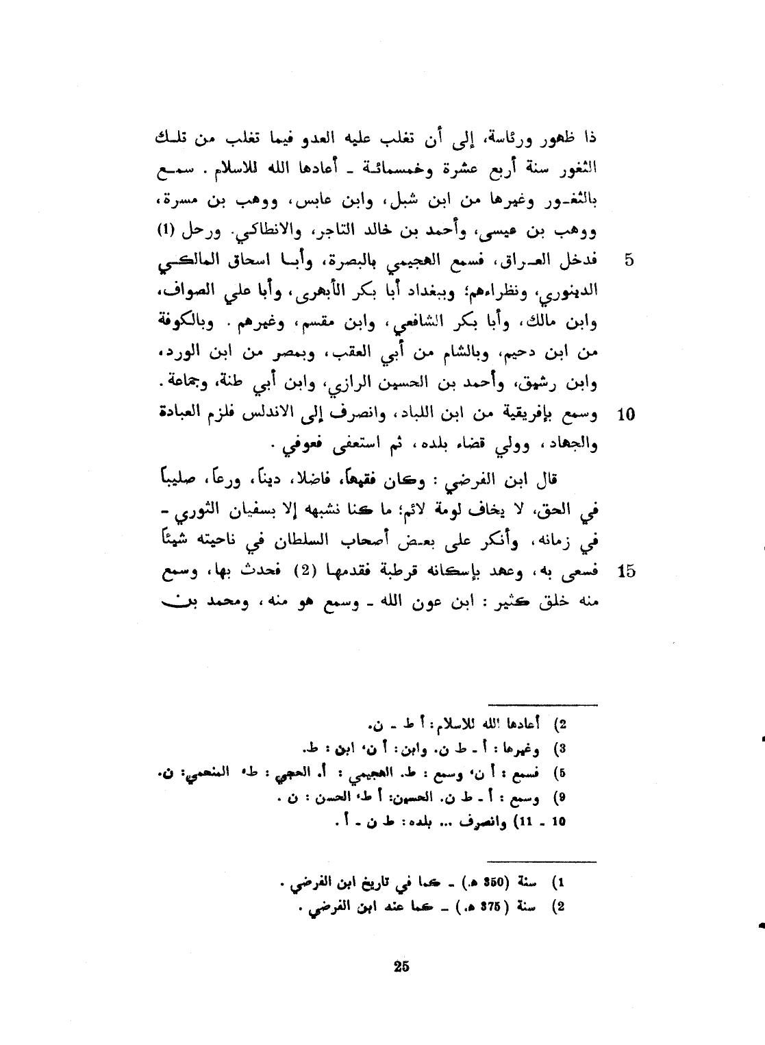ذوي ظهور ورئاسة. الى أن تغلب عليها العدو، فيما تغلب عليه من تلك الثغور، سنة أربع عشرة وخمسماية. سمع بالثغور من ابن شبل، وابن عباس، ووهب بن مسرة، ووهب بن عيسى، وأحمد بن خالد التاجر، والأنطاكي. ورحل فدخل العراق، فسمع بها وبالبصرة: من أبي إسحاق المالكي، والدينوري، ونظائهما. وببغداد أبا بكر الأبهري، وأبا علي الصواف، وابن مالك، وأبا بكر الشافعي، وابن مقسم، وغيرهم. وفي الكوفة، من ابن دحيم، وبالشام، من أبي العقب، وبمصر من ابن الورد، وابن رشيق، وأحمد بن الحسن الرازي، وابن أبي طنة، وجماعة. وبإفريقية من ابن اللباد، وانصرف الي الأندلس، فلزم العبادة والجهاد، ووليَ قضاء بلده. ثم استعفى، فعوفي. قال ابن الفرضي: وكان فقيهاً فاضلاً، ديّناً ورعاً صليباً في الحق لا يخاف في الله لومة لائم. ما كنا نشبهه إلا بسفيان الثوري في زمانه. وأنكر على بعض أصحاب السلطان في ناحية شيئاً، فسعي به وعهد بإسكانه قرطبة، فقدمها، فحدث بها، وسمع منه خلق كثير: ابن عون الله - وسمع هو منه - ومحمد بن