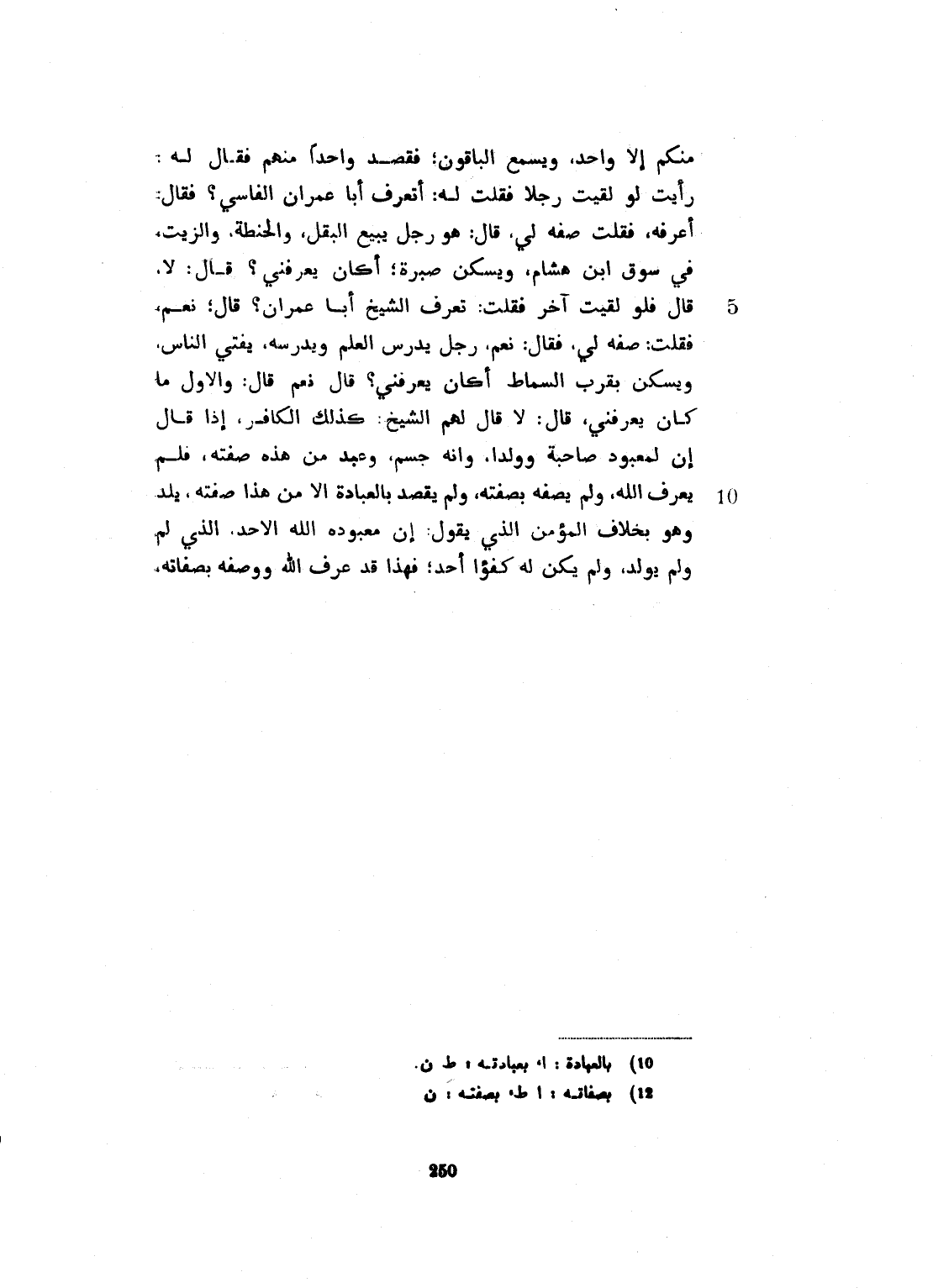 إلا واحد، ويسمع الباقون. فقال له: أرأيت لو لقيت رجلاً فقلت له: تعرف الشيخ أبا عمران، فقال: نعم. فقلت: صفه لي، فقال: نعم. هو رجل يدرس العلم ويدرسه، يفتي الناس ويسكن بقرب السماط، أكان يعرفني؟ قال: نعم. قال: والأول ما كان يعرفني؟ قال: لا. قال لهم الشيخ: كذلك الكافر، إذا قال لمعبوده صاحبة، وولداً، وأنه جسم، وقصد بعبادته مَن هذه صفته. فلم يعرف الله، ولم يصفه بصفاته. ولم يقصد بالعبادة إلا مَن هذه صفته، وهو بخلاف المؤمن الذي يقول إن معبوده: الله، الأحد، الذي لم يلد ولم يولد، ولم يكن له كفؤاً أحد. فهذا قد عرف الله، ووصف بصفته.