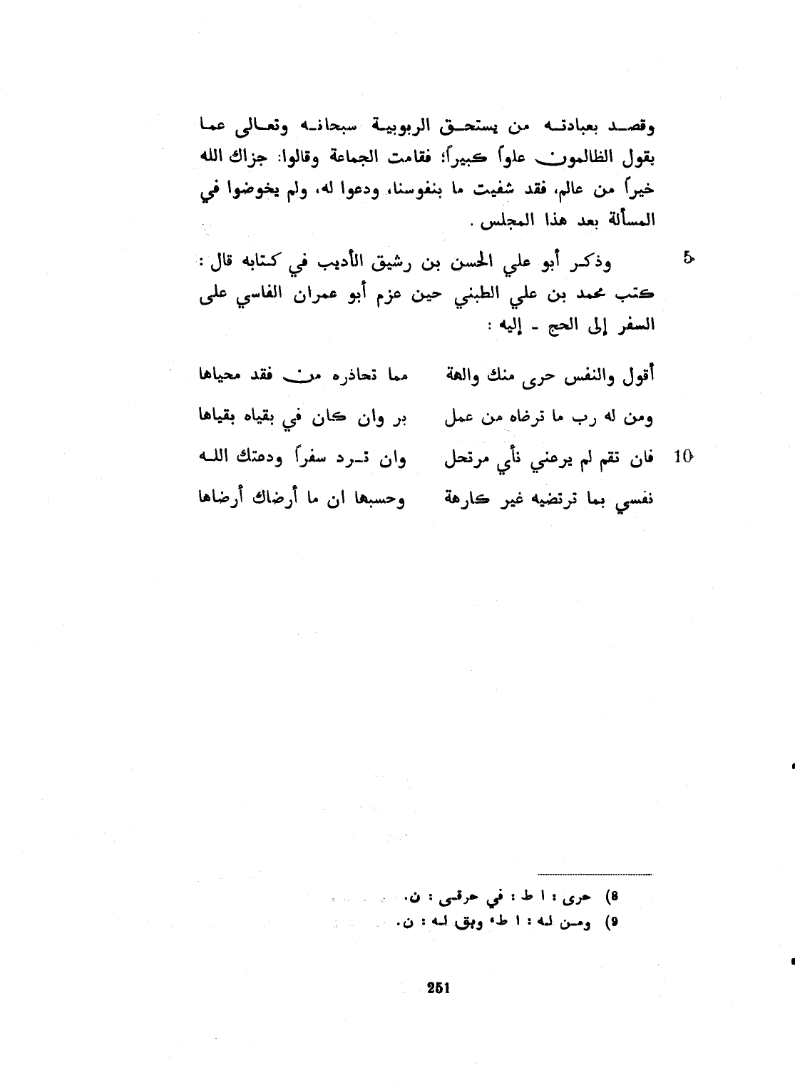 وقصد بعبادته من يستحق الربوبية سبحانه وتعالى عما يقول الظالمون، علواً كبيراً. فقامت الجماعة وقالوا له: جزاك الله خيراً من عالم. فقد شفيت ما بنفوسنا، ودعوا له، ولم يخوضوا في المسألة بعد هذا. وذكر أبو الحسن ابن رشيق الأديب في كتابه، قال: كتب محمد بن علي الطبني حين عزم أبو عمران على السفر الى الحج إليه: