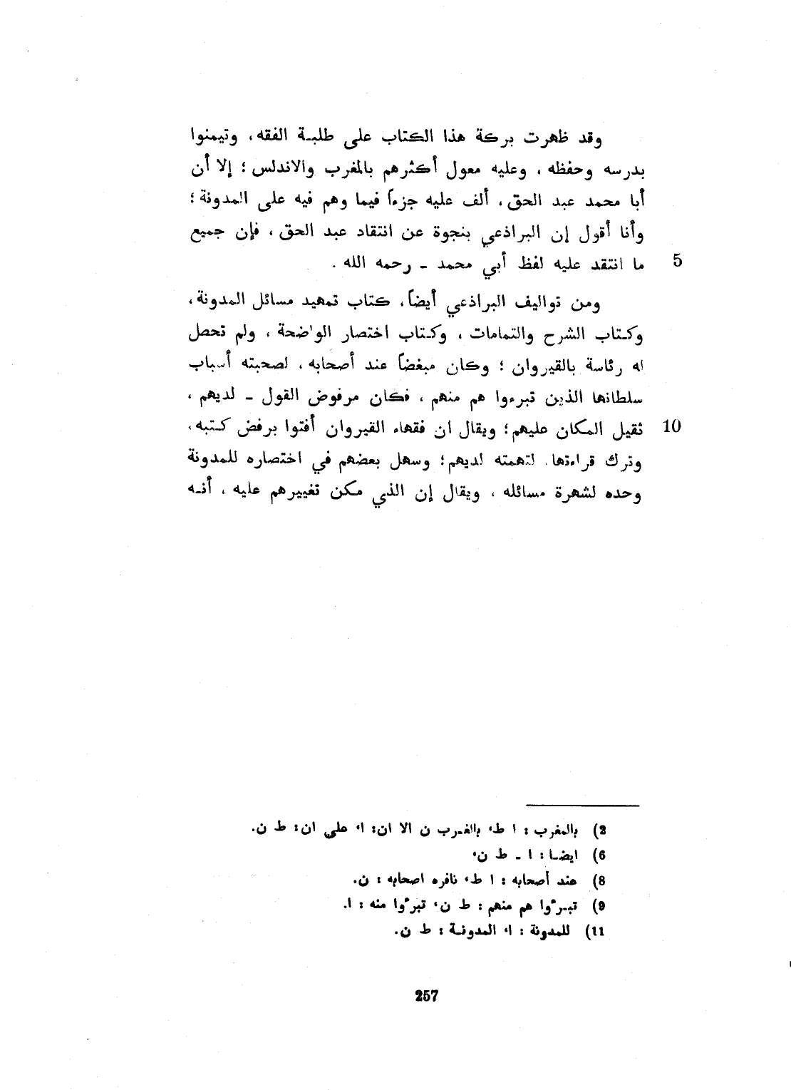 وقد ظهرت بركة هذا الكتاب على طلبة الفقه. وتيمنوا بدرسه وحفظه. وعليه معول أكثرهم بالمغرب والأندلس، على أن أبا محمد عبد الحق ألّف عليه جزءاً، فيما وهم فيه على المدونة. وأنا أقول: إن البرادعي ما أدخل ما أخذ عليه فيه، إلا كما نقله أبو محمد ابن أبي زيد، ومن تآليفه أيضاً كتاب تمهيد مسائل المدونة على صفة اختصار أبي محمد وزياداته. ولأجل ذلك قصده بعض الطلبة ليسمعه منه. فلما أتم الصدر، أغلق كتابه وقال: قد سمعت الباقي على أبي محمد. وهل زدت فيه غير هذا الصدر، وكتاب الشرح والتّمامات، وكتاب اختصار الواضحة. ولم تحل له رئاسة بالقيروان، وكان مبغضاً عند أصحابه، بصحبة سلاطينها الذين تبرأوا منهم. فكان مرفوض القول لديهم، ثقيل المكان عليهم. ويقال إن فقهاء القيروان أفتوا برفض كتبه، وترك قراءتها لتهمته لديهم، وسهل بعضهم في اختصاره المدونة وحده، لشهرة مسائله. ويقال إن الذي مكّن تغيرهم عليه، أنه