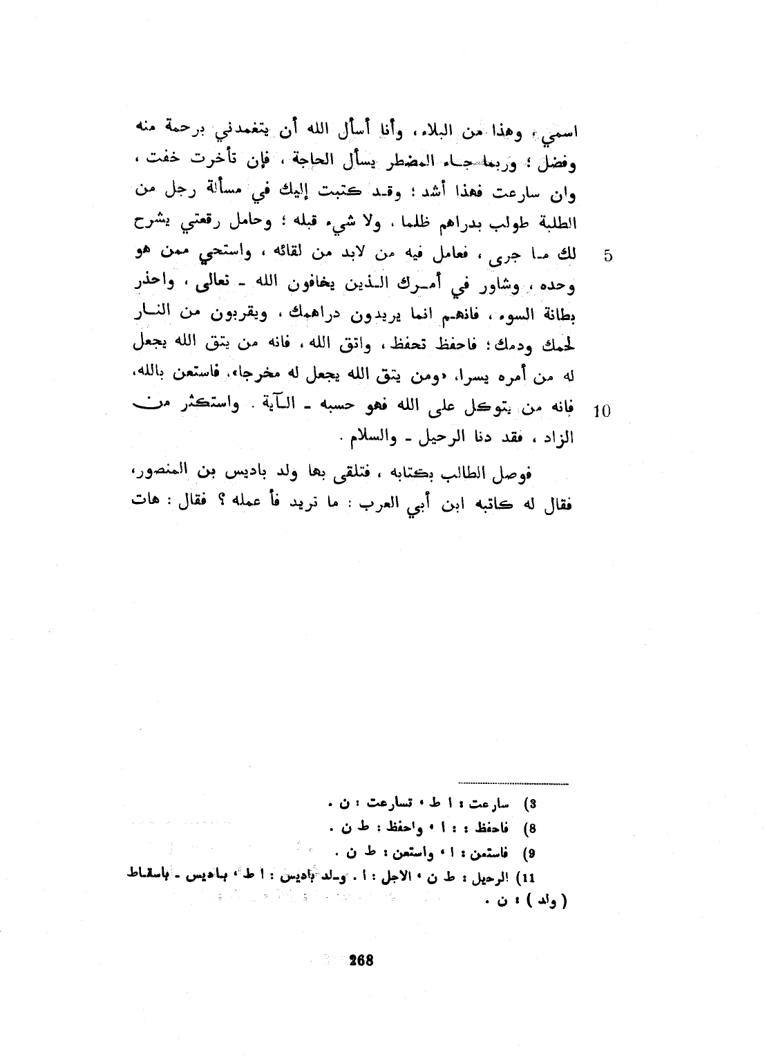 اسمي. وهذا من البلاء. وأنا أسأل الله أن يتغمدني برحمة منه، وفضل. وربما جاء المضطر يسأل الحاجة. فإن تأخرت، خفت، وإن سارعت، فهذا أشرّ. وقد كتبت إليك في مسألة رجل من الطلبة، طولب بدراهم ظلماً، ولا شيء له. وحامل رقعتي يشرح لك ما جرى، فعامل فيه مما لابد من لقائه، واستح ممن هو وحده. وشاور في أمرك الذين يخافون الله تعالى، واحذر بطانة السوء. فإنهم إنما يريدون دراهمك ويقرّبون من النار لحمك ودمك. فاحفظ، تحفظ واتق الله، فإن من يتق الله يجعل له من أمره يسرا. ومن يتق الله يجعل له مخرجا. واستعن بالله، فإنه من يتوكل على الله، فهو حسبه. الآية. واستكثر من الزّاد، فقد دنا الرحيل. والسلام. فتلقى الطالب بكتابه، ولد المنصور. فقال له كاتبه - ابن أبي العرب - ما تريد؟ فأعلمه. فقال: هات