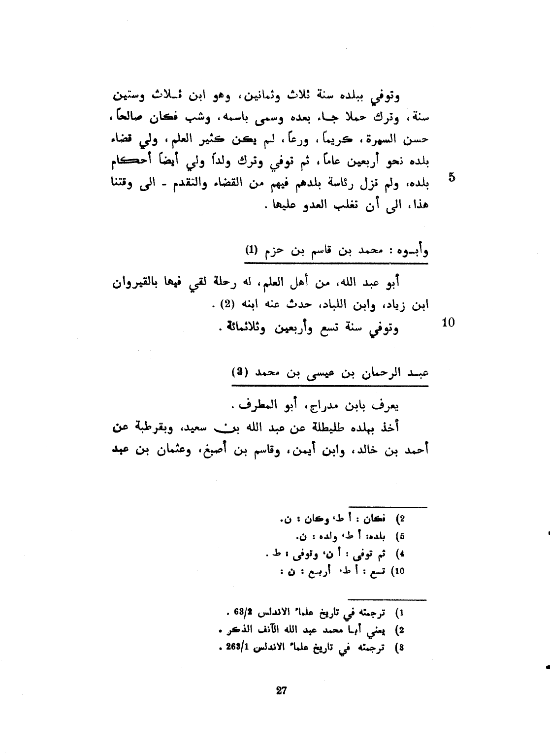 وتوفي ببلده، سنة ثلاث وثمانين، وهو ابن ثلاث وستين سنة. وترك حملاً جاء بعده، وتسمى باسمه. فكان صالحاً حسن السيرة كريماً ورعاً، لم يكن له كثير علم، وليَ قضاء بلده، نحو أربعين عاماً. توفي وترك ولداً، وليَ أيضاً أحكام بلده، ولم تزل رئاسة بلدهم فيهم من القضاء والتقدم، الى وقتنا هذا. الى أن تغلب العدو عليها. وأبو محمد بن قاسم بن حزم أبو عبد الله، من أهل العلم، له رحلة لقي فيها بالقيروان ابن زياد، وابن اللباد، حدث عنه ابنه، وتوفي سنة أربع وأربعين وثلاثماية. رحمه الله.